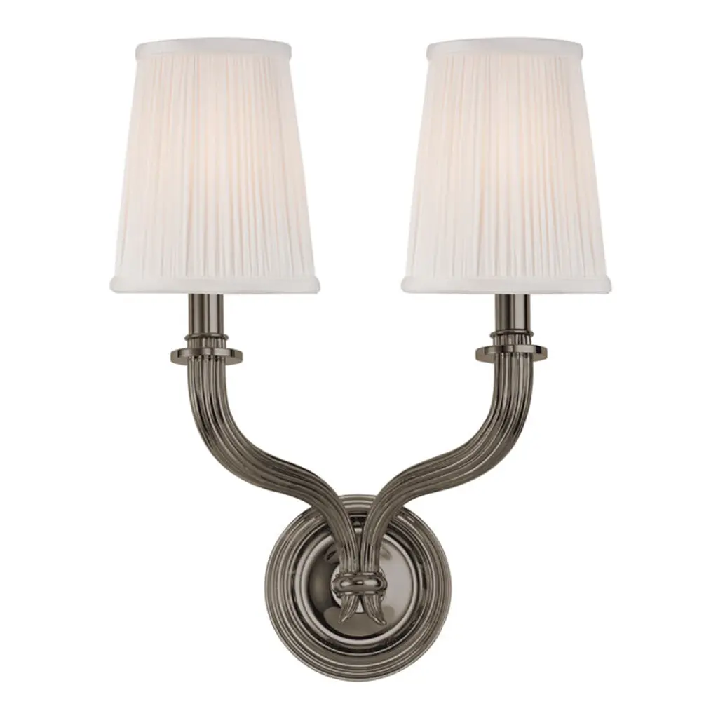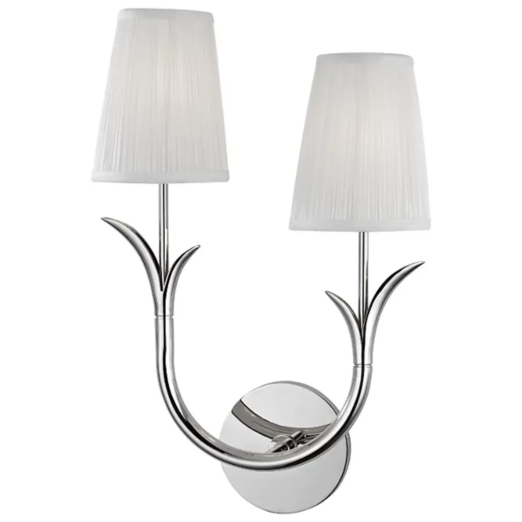 Nature-inspired elegance. The Deering 2 Light Wall Sconce by Hudson Valley Lighting brings a fresh outlook to a transitional space. Reminiscent of budding stems, the Metal design has a round wall plate that holds an asymmetrical pair of candelabra lights. Topped with White Silk pleated shades, this nature-inspired sconce is statement-making lighting in any space. Better in pairs, the Deering brings expressive lighting to a modern foyer, dining room, bedroom or living room.