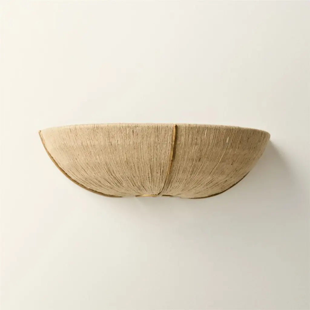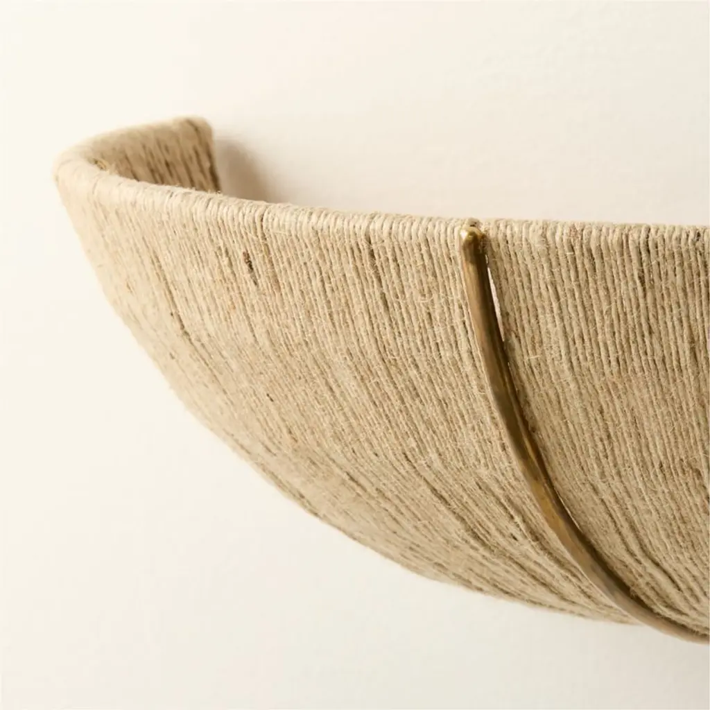 Natural jute sconce by award-winning French design duo dach&zephir is inspired by vintage designs from France and Guadeloupe. The warm brass frame is aged by hand in a multistep process to bring out the metal's rich tonal highs and lows. Paired with a hand-wrapped natural jute shade softly filters the light. CB2 exclusive.
