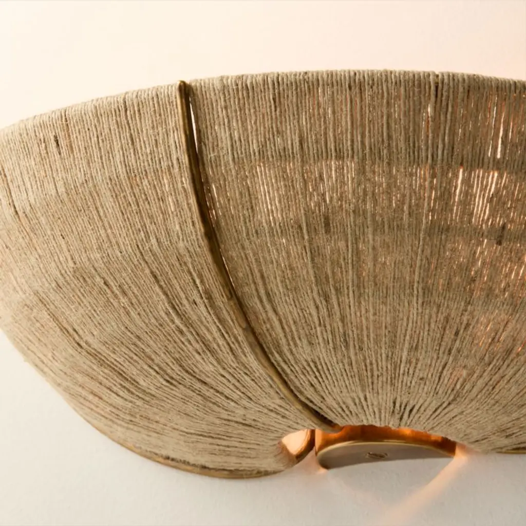 Natural jute sconce by award-winning French design duo dach&zephir is inspired by vintage designs from France and Guadeloupe. The warm brass frame is aged by hand in a multistep process to bring out the metal's rich tonal highs and lows. Paired with a hand-wrapped natural jute shade softly filters the light. CB2 exclusive.