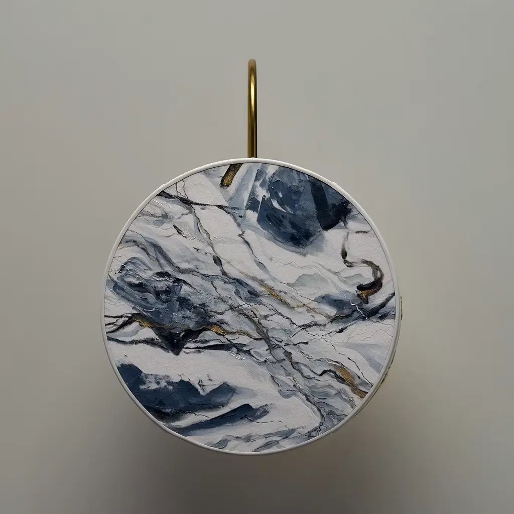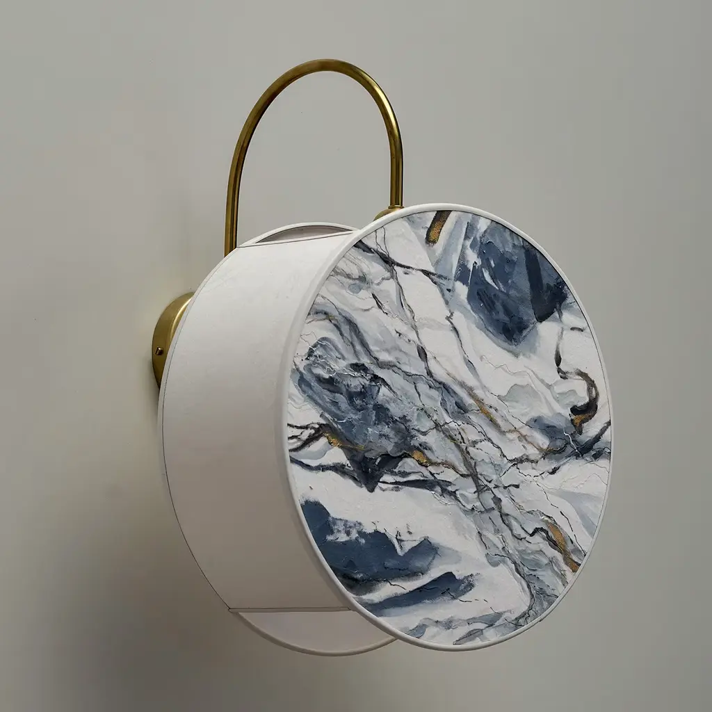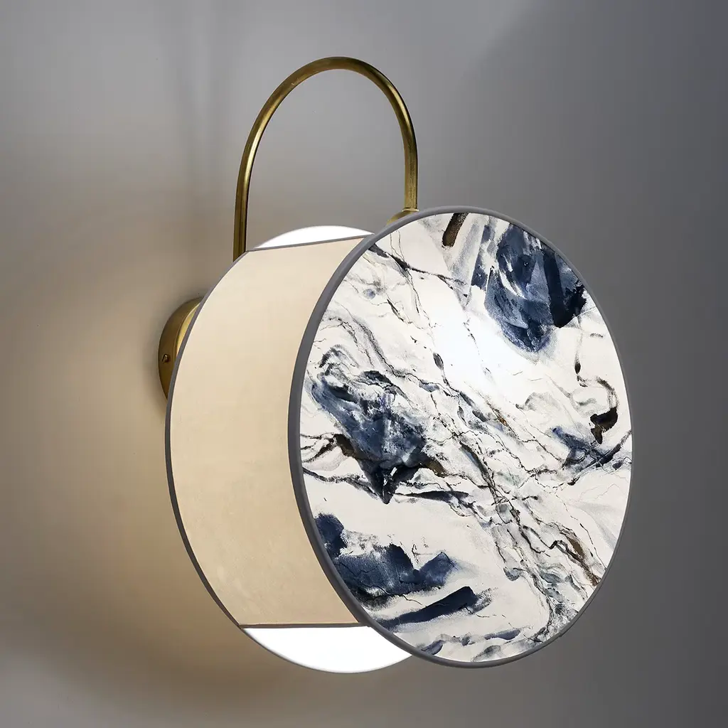 The front facade of the Denim Lampshade is entirely hand-painted with infinite gradations in ultramarine blue veins, gray blue with light dark threads and dull gold streaks. A velvet base accentuates the stucco relief in every color detail. Light enhances the nuances and the preciousness of ivory velvet completes the elegant look.