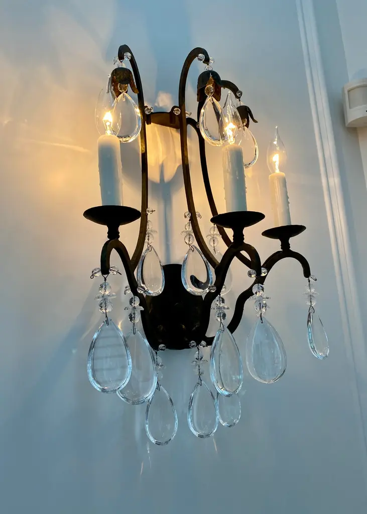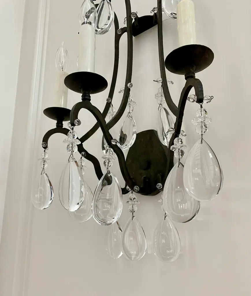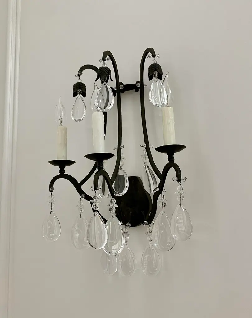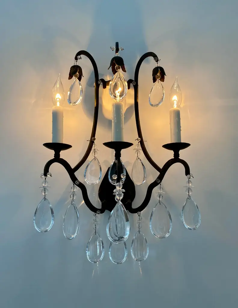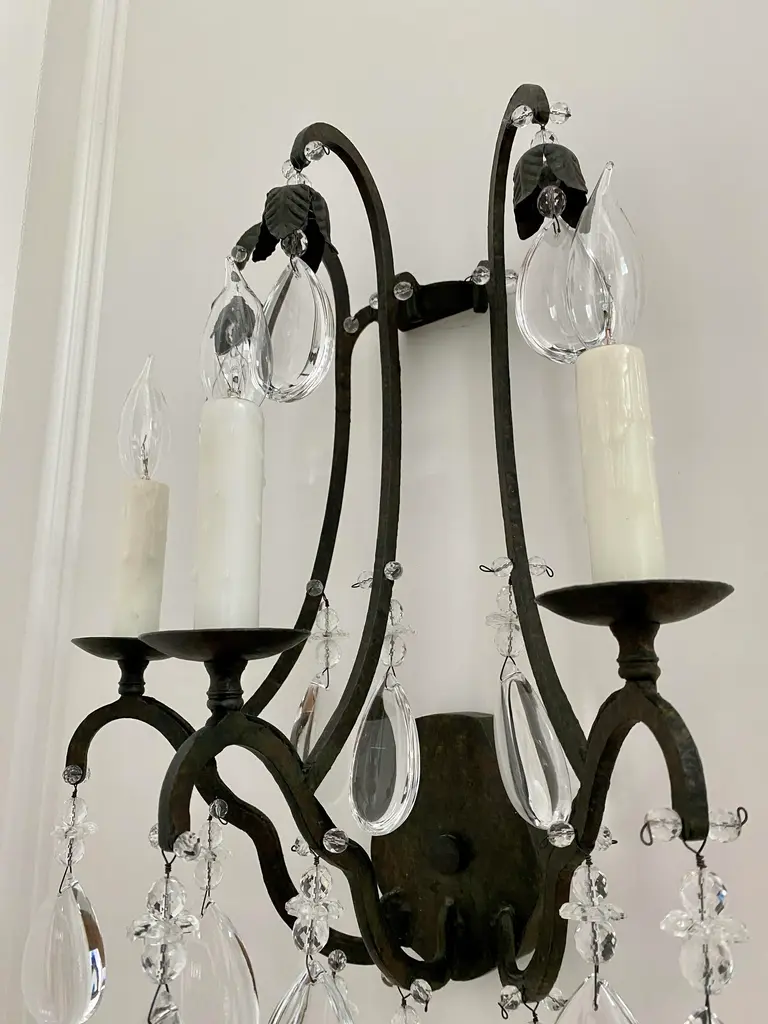 This listing is for one Dennis & Leen 3-arm candlestick wall sconce, available are 2 pieces. Beautiful clear lead crystal teardrops hang from two tiers on a custom-finish black iron frame. The piece has leaf details and curved iron. In excellent working condition, recently removed from a smoke-free home. - Dimensions: 24" H x 16" W x 9.5" D, 7.35 Lbs - Dimmable - Attaches via two holes on top and bottom - Direct wire; professional installation recommended