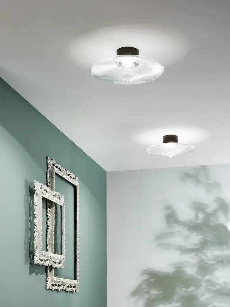 In Apulia, Italy, the Pumo is a traditional ceramic handicraft that represents a blooming bud, a symbol of prosperity, fecundity, and civil magnificence. It is frequently found as an ornament on the façades of stately as well as essential buildings. The Desideria lamp expresses the link between the designer and Puglia. A transparent ampoule preserves and protects a luminous glass Pumo inside. It can be picked by whoever wants to rediscover its real meaning, which has been lost over time. Wall/ceiling lamp. Borosilicate glass and glossy black chromed metal. lled 12,6W - 24V - 1966 Lumen - 3000K Driver Triac - 180/295 V - CC 700mA - 16,8W Energy class from A to G Dimmable