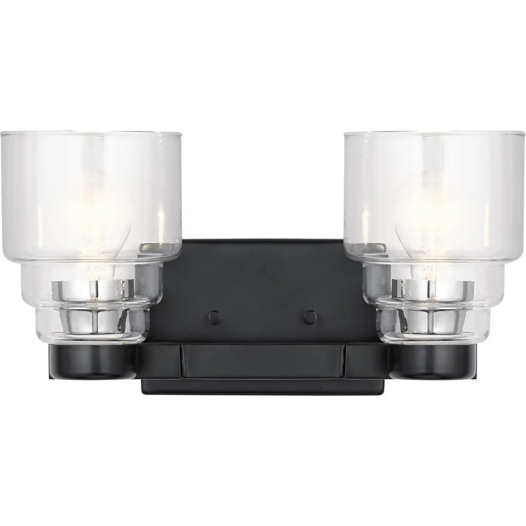 Finish: Matte Black Glass: Clear and Frosted Height: 8-1/4" Width: 14-1/2" Projection: N/A Chain Length: N/A Bulb Requirements (Not Included): (2) Two Medium Base 60 Watt All Mounting Hardware Included Can only be mounted facing up 15 Year Warranty
