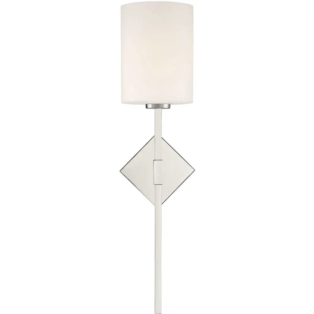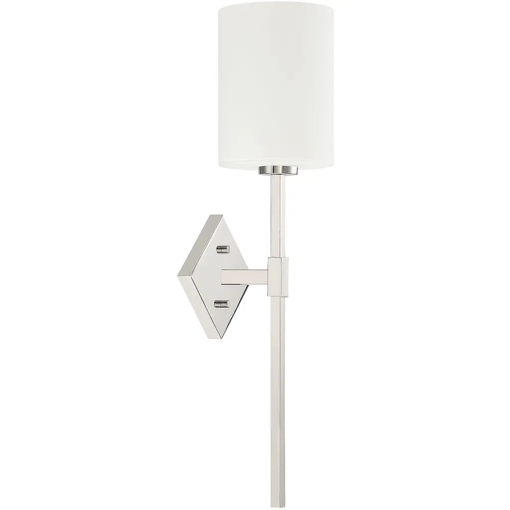 The Savoy House Destin 1-light wall sconce is a contemporary decorative accent and a lovely source of light all in one. It has a sleek modernism that will add a pop of high style and blend well with your transitional, modern, urban farmhouse or eclectic decor. The polished nickel finish is smooth and luxurious. The fixture has a diamond-shaped wall plate and a long, slim vertical arm holding a cylindrical white opal glass shade. This sconce measures 6" wide by 25" high and holds a 60W standard size bulb, making it a terrific addition to your dining room, living room, entryway, bedroom, great room, office, hallway or media room walls. Its a modern, elegant sconce youll appreciate for years to come.