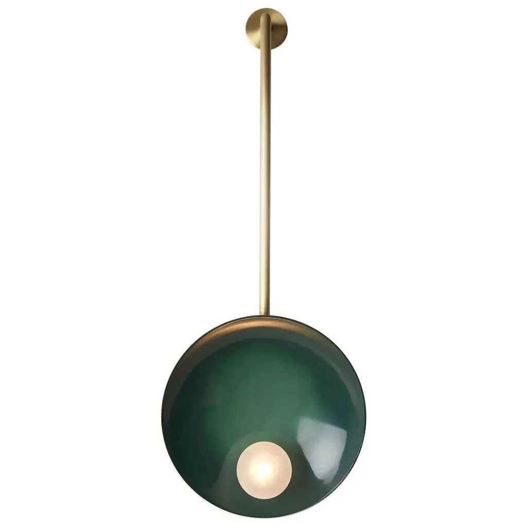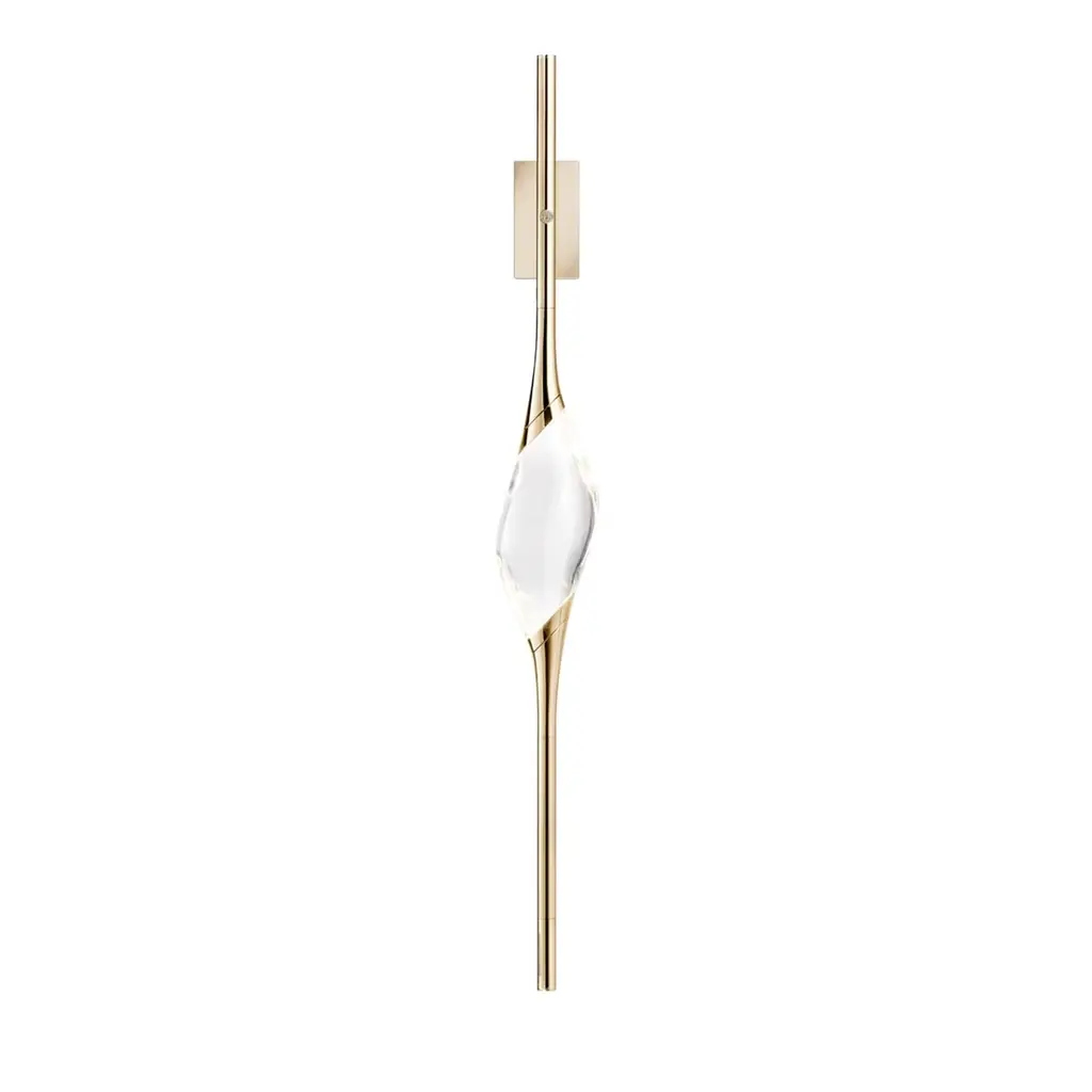 A luminous display of molten handblown glass, the Dew Wall Sconce by SkLO is an expressive piece designed by Paul Pavlak and Karen Gilbert. Driven by the desire to showcase the skill and artistry of sculpted Czech glass, the duo created this piece with the unpredictable nature of liquid glass in mind. A circular wallplate fastens the piece in place while a slender brass tube drops to a layered, dripping glass form containing its light source at its end.