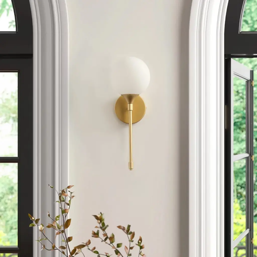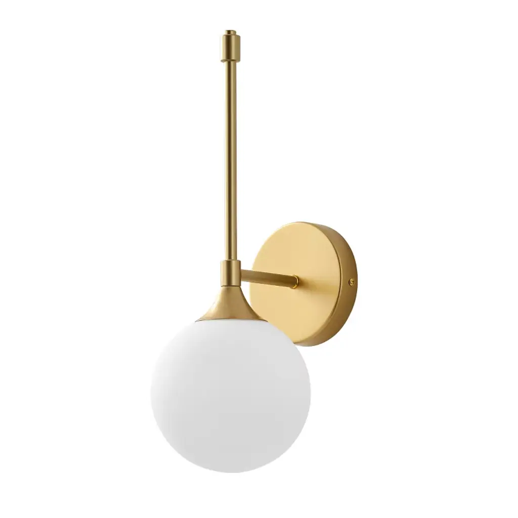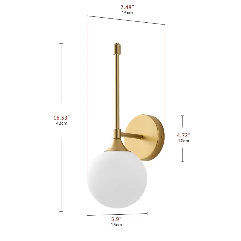 Specifications: Type: Modern Wall SconceMaterials: Iron, GlassFinish: PaintedColor: GoldVoltage: 120VMax Wattage: 25WBulb Base: G9Dimensions: 7.48 in. W x 5.9 in. D x 16.53 in. HNumber of Lights: 1 Light (bulbs not included) Item not designed to be installed in Canada Modern Design: Modern geometric ball wall sconce includes milk white glass globe shade and high-quality painted gold metal lamp body, the whole light fixture is extremely minimalist, adding a nice addition to your home space. Quality Assurance: High-quality iron and glass materials were used to craft the wall sconce. All products in the factory have to undergo rigorous safety monitoring to ensure quality and safety, which is beautiful, corrosion-resistant, and durable for a long time. Easy to Install: There is no need to worry about the installation difficulty. to achieve installation quickly, all installation hardware and installation instructions are included in the package for you. If you have any problems, please feel free to contact us. ETL Listed & Bulb Requirement: ETL Listed for your safety. The wall sconce is a built-in standard G9 socket. suggest using the dimmable G9*2 base bulbs (Max 25W, 120V); it could be a fully dimmable and compatible dimmer switch. Bulbs and a dimmer switch are not included. Ideal Application: The white glass wall Light combines modern and vintage styles, which makes it a perfect decor for your bathroom, bedroom, living room, corridor, coffee shop, office, etc. It will be a beautiful and practical gift for your family or friends.