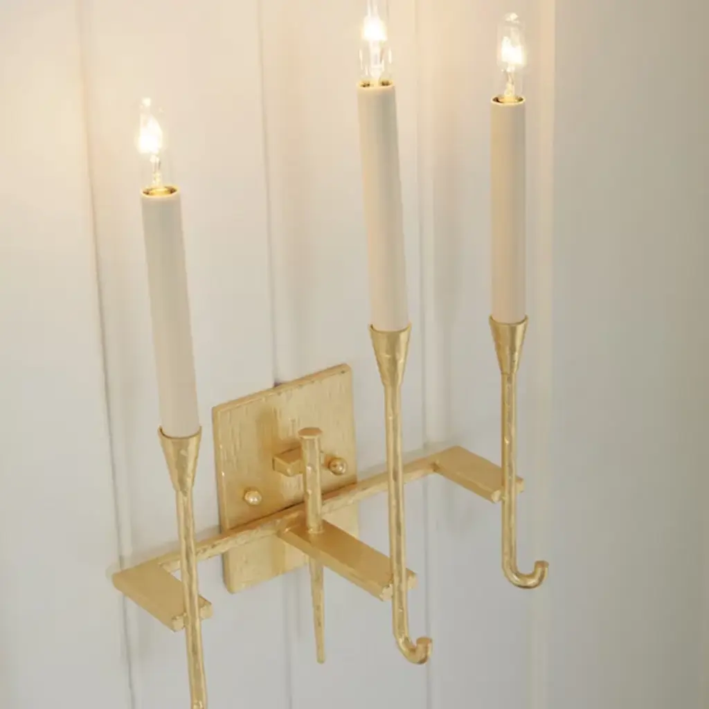The Diego Wall Sconce from Wildwood updates traditional candle lighting for modern homes. Its steel construction provides stability, while the hammered gold leaf application gives each piece subtle variations in texture. Three separate light sources extend outward from the base, providing useful illumination for hallways, alongside mirrors, or next to doorways. The sconce’s simple mounting system makes installation straightforward, and the classic candle design connects with traditional architectural elements without feeling dated or overly ornate.
