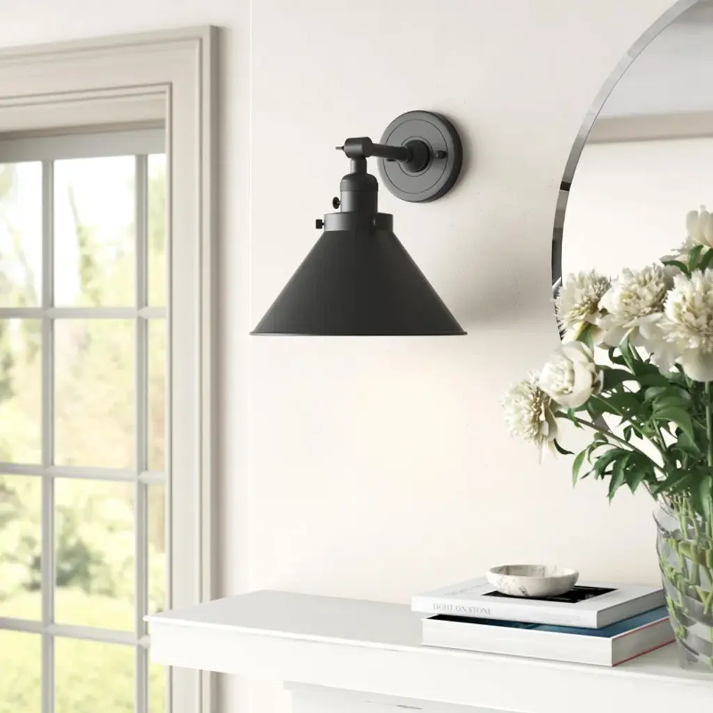 This dimmable armed wall sconce has an industrial design that brings character to any bathroom. It's crafted from damp-rated metal and has a round backplate with a turned arm and cone-shaped shade. The swivel arm lets you adjust the angle at 5° intervals and it comes with a two-year warranty. Just be sure to buy the 100 W bulb separately.