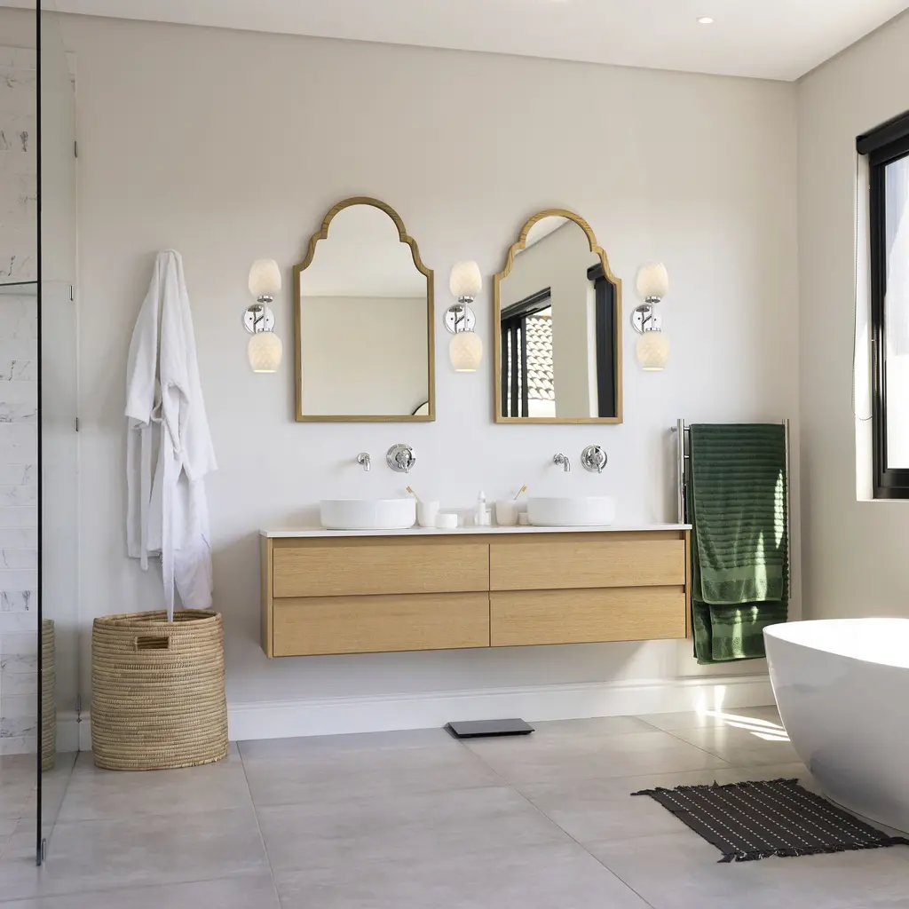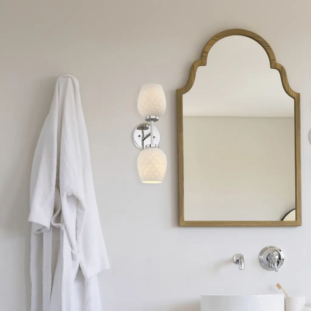 The geometric etched opal glass shades of the Dita family evoke the visual of a sculpted pineapple. The available brushed gold and polished nickel finishes of this collection will provide an instantly classic look in living rooms, dining rooms, entryways, or other medium-to-large sized rooms. Though Dita is especially complimentary to coastal or tropical-themed decors, its flexible enough to work with just about any interior design theme.