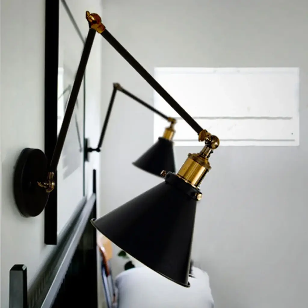 A stunning choice for a refined modern interior, this vintage-inspired wall lamp designed by Michele Bönan for Estro exudes an industrial-chic character of ergonomic functionality. Comprised of two adjustable arms with two shades each supporting an E27 LED lightbulb (max 60W). The structure is fashioned of dark brushed bronze-finished brass, while the two shades are crafted of black-lacquered metal.