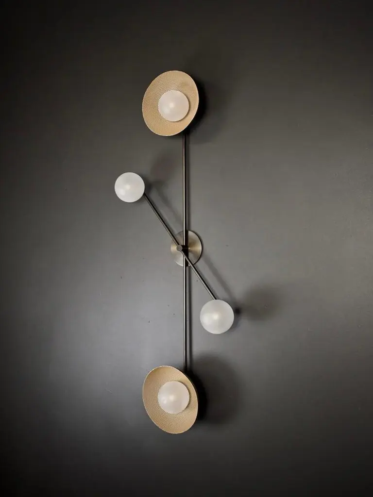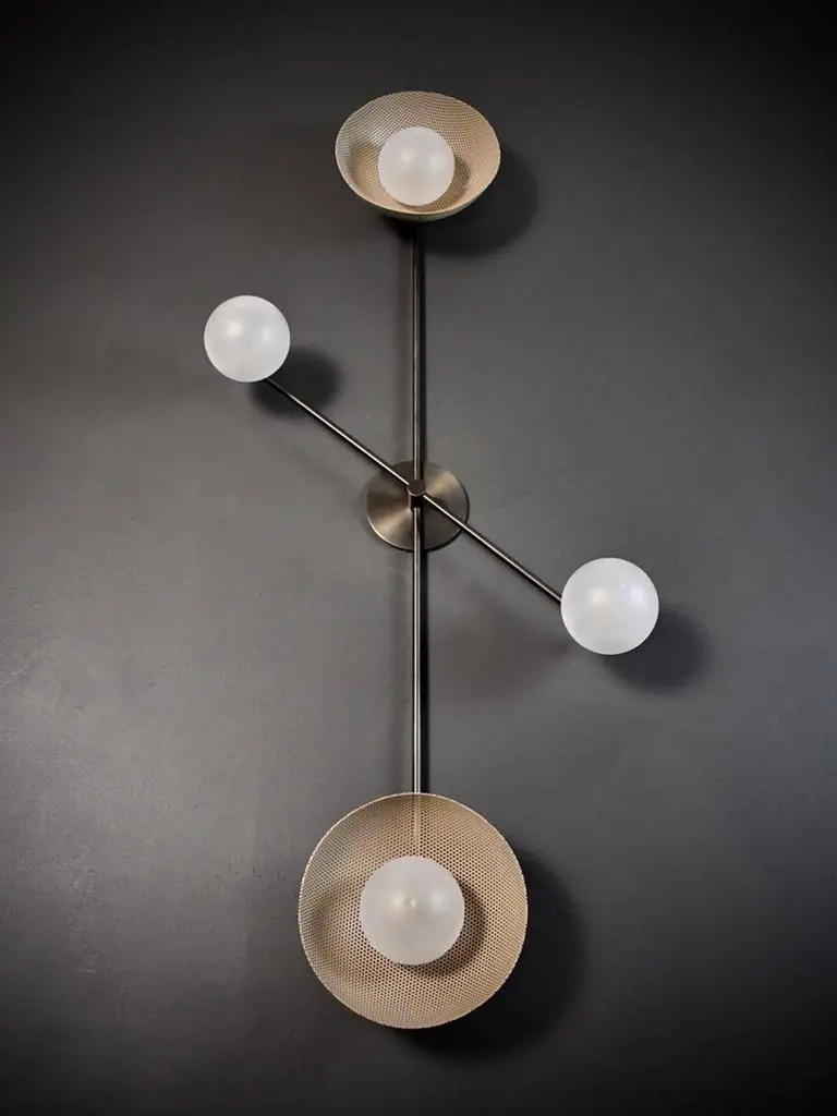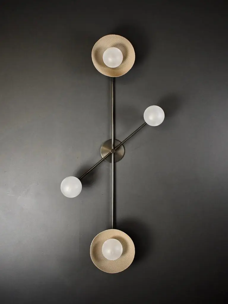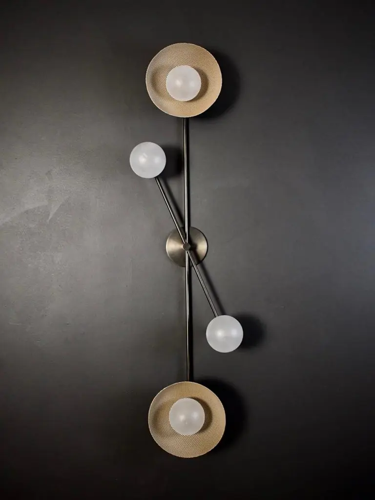 Division wall lamp or flushmount ceiling fixture in blown glass, enameled mesh and bronze by Blueprint Lighting, 2020.A striking study in material and texture, Division is a piece of functional sculpture that is equally at home in residential, commercial and hospitality projects. This pieces can function as a wall sconce or as a flushmount ceiling light. Division is shown here in our Dark Bronze and Smoked Oyster enamel mesh, but may be made in any of our 6 in-house metal finishes or 36 in-house enamel colors. Overall dimensions as shown: 6" D x 45" H x 24" W the shorter arm as shown is 24.5" long. Metal mesh shades are 8.5" diameter. Blown opal glass globes are 4" diameter. Backplate is 4.75" diameter. Specs: Uses four (4) G9 socket bulbs (halogen-style socket with 2 pins). We recommend G9 LED bulbs: 5w LED with 60 watt equivalent. Bulbs included. Dimmable. UL-listed.