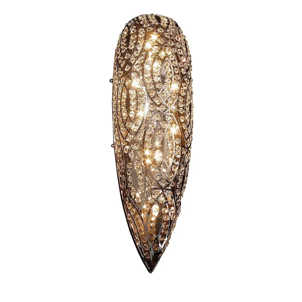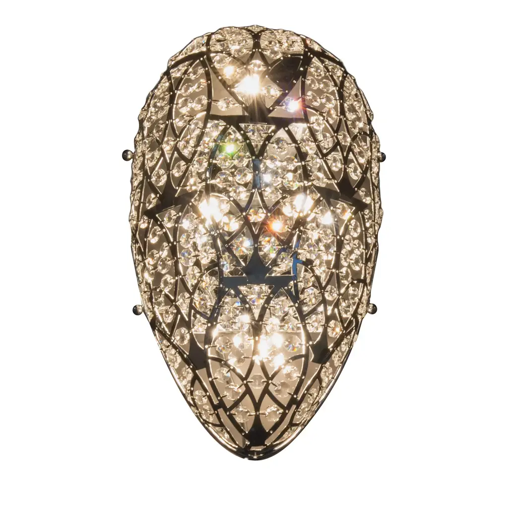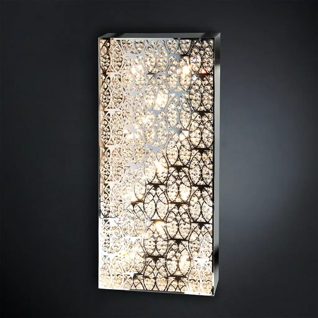 This elegant wall lamp will be a superb addition to a modern interior, enlivening the texture of a wall in a living room or entryway. The rectangular silhouette of this piece is made up of sinuous steel elements creating a luminous sense of movement and adorned with multi-faceted crystals that were applied manually. The bulbs inside are 11 LD G9 3W. This piece can be customized in dimensions and metal finish, here in glossy chrome. Please ask the Concierge for options and pricing.