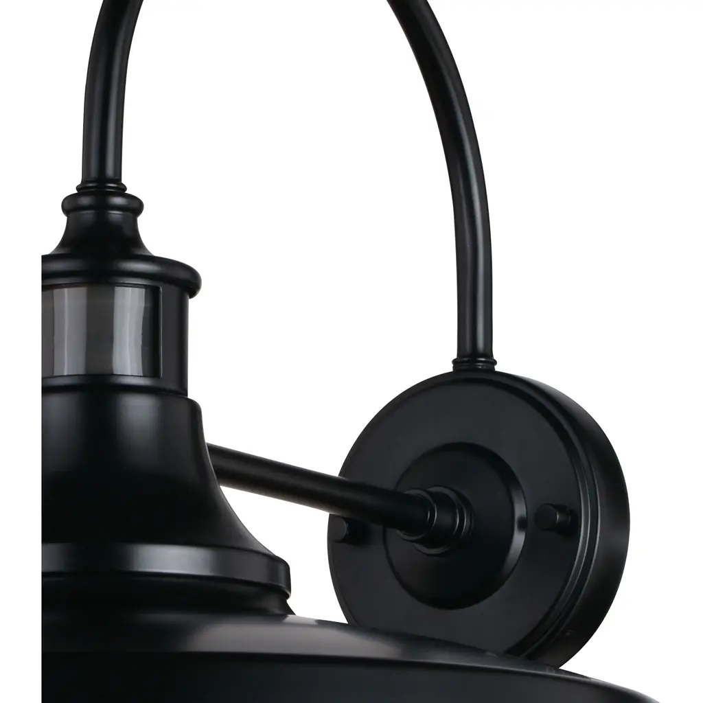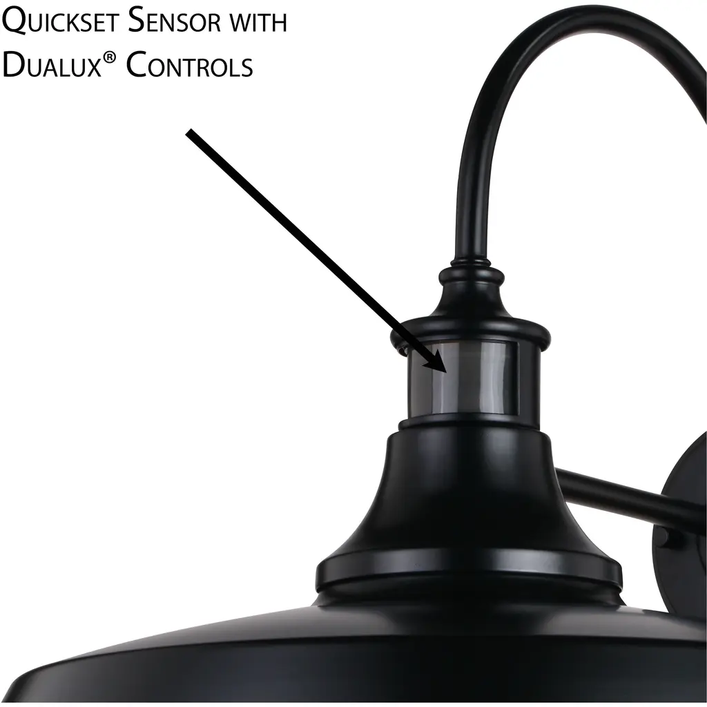 Modern farmhouse never looked so good as in the Dorado collection. Large open shades offer the maximum light output in your space. This outdoor wall light is ideal for your covered porch, entryway, garage, or any other area of your home. Dualux patented dual-level security lighting is outdoor lighting made smarter - brighter light at dusk, dimmer at night, brightening instantly when it detects motion. Designed to reliably and effortlessly enhance your home's beauty, security and efficiency from dusk to dawn with its built in motion sensor and photocell. This fixture works with most dimmable LED bulb models. This decorative outdoor security light is designed to enhance the beauty, safety, and efficiency of your home.