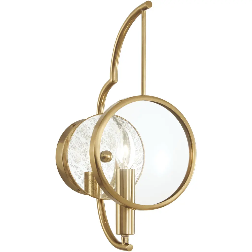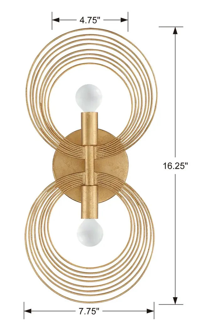 Concentric circles made of wrought iron given a gleaming gold finish form the base and finial of this two-bulb sconce.