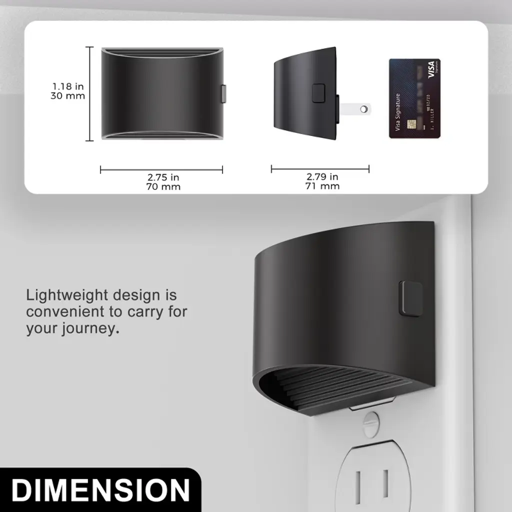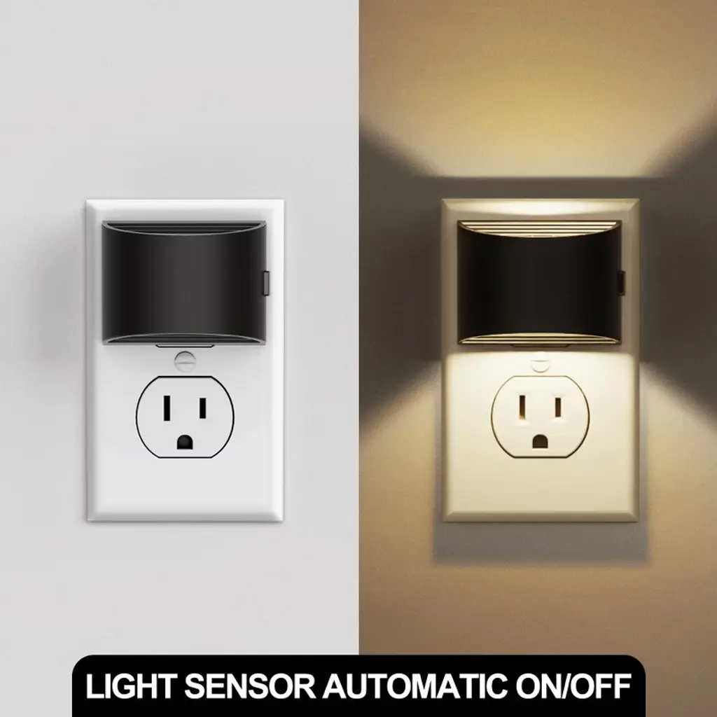 This set of two 1W plug-in night lights features a semi-arc wall light design with up and down warm white light (3000K) for a cozy atmosphere. Equipped with a built-in light sensor, these lights automatically turn on in low light conditions and off during the day. The convenient button control allows you to switch between three brightness levels, with a memory function that remembers your last setting after turning off. Long press the button for 2 seconds to power off the light sensor and the light itself. Designed with a sleek black housing and US dual plug, these night lights are perfect for bedrooms, hallways, or bathrooms.