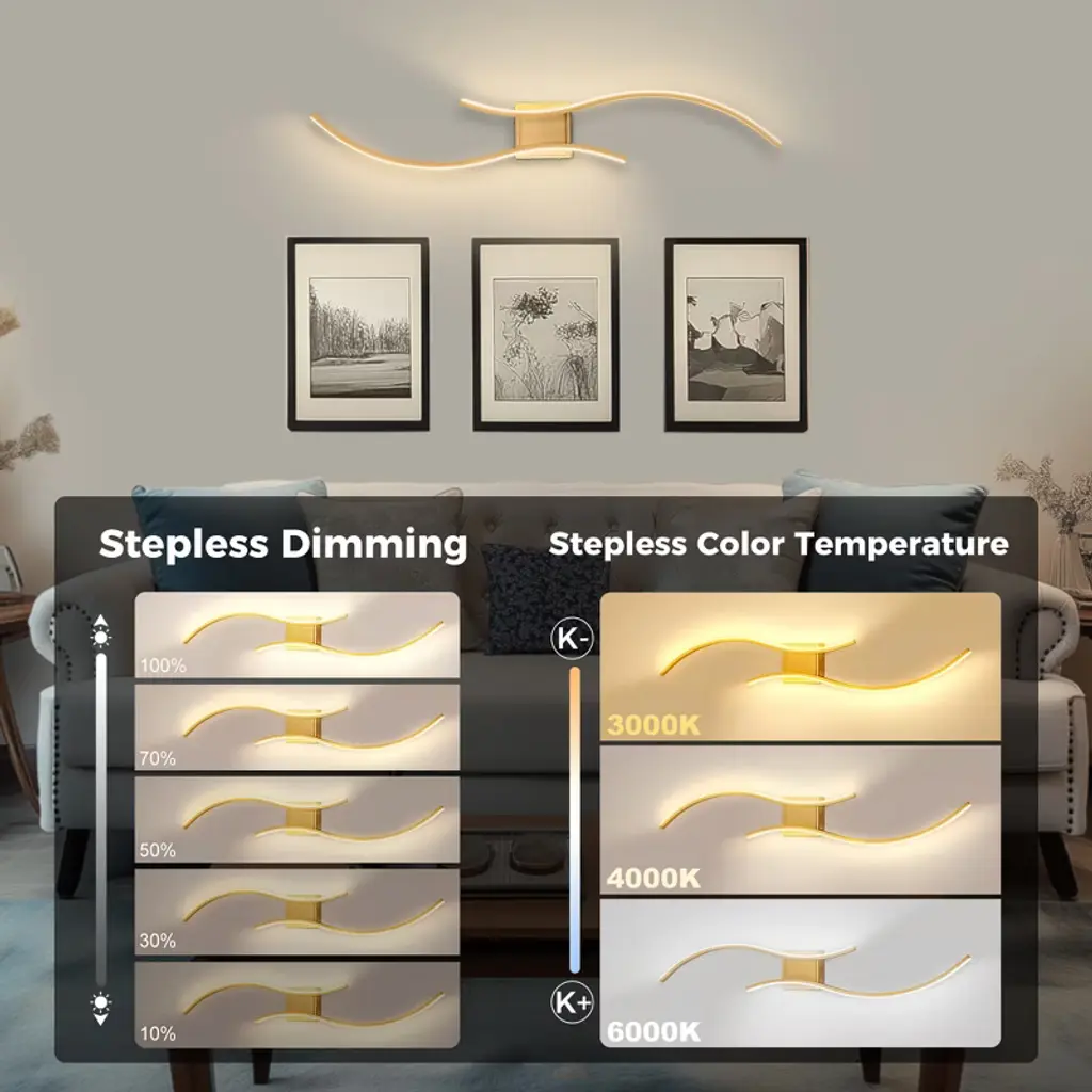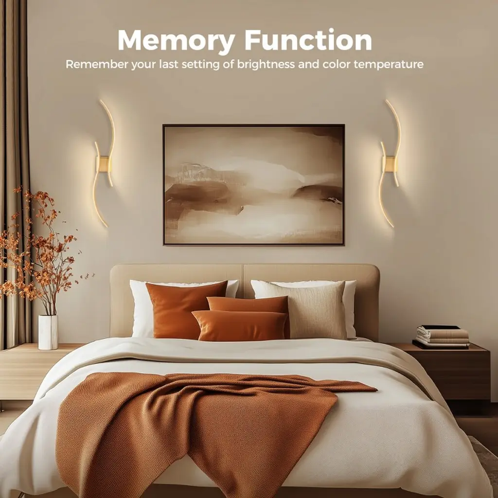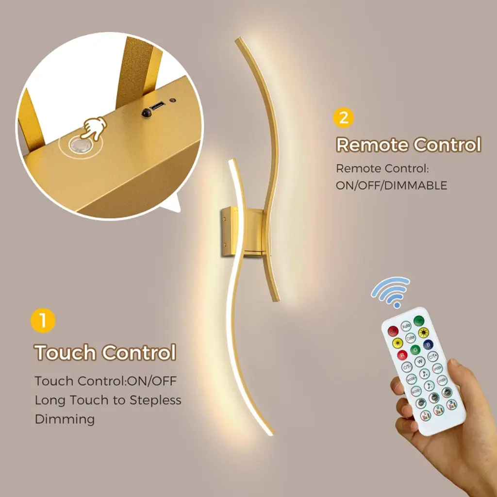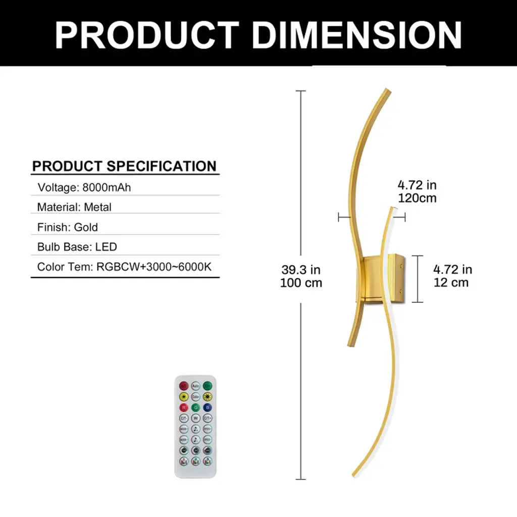 Light up your walls with color and creativity using this set of 2 39 in. modern wireless wall sconces. Featuring 10 vibrant colors, stepless dimming, and a sleek gold finish, these LED wall lights are designed to elevate your space with both style and function. The cordless design offers flexibility-install them anywhere without worrying about wiring. Perfect for bedrooms, hallways, living rooms, or accent walls, these sconces double as stunning wall decor and customizable mood lighting. Whether you're setting the tone for movie night or creating a relaxing nighttime glow, these wall lights adapt to every moment with just a touch of the remote.