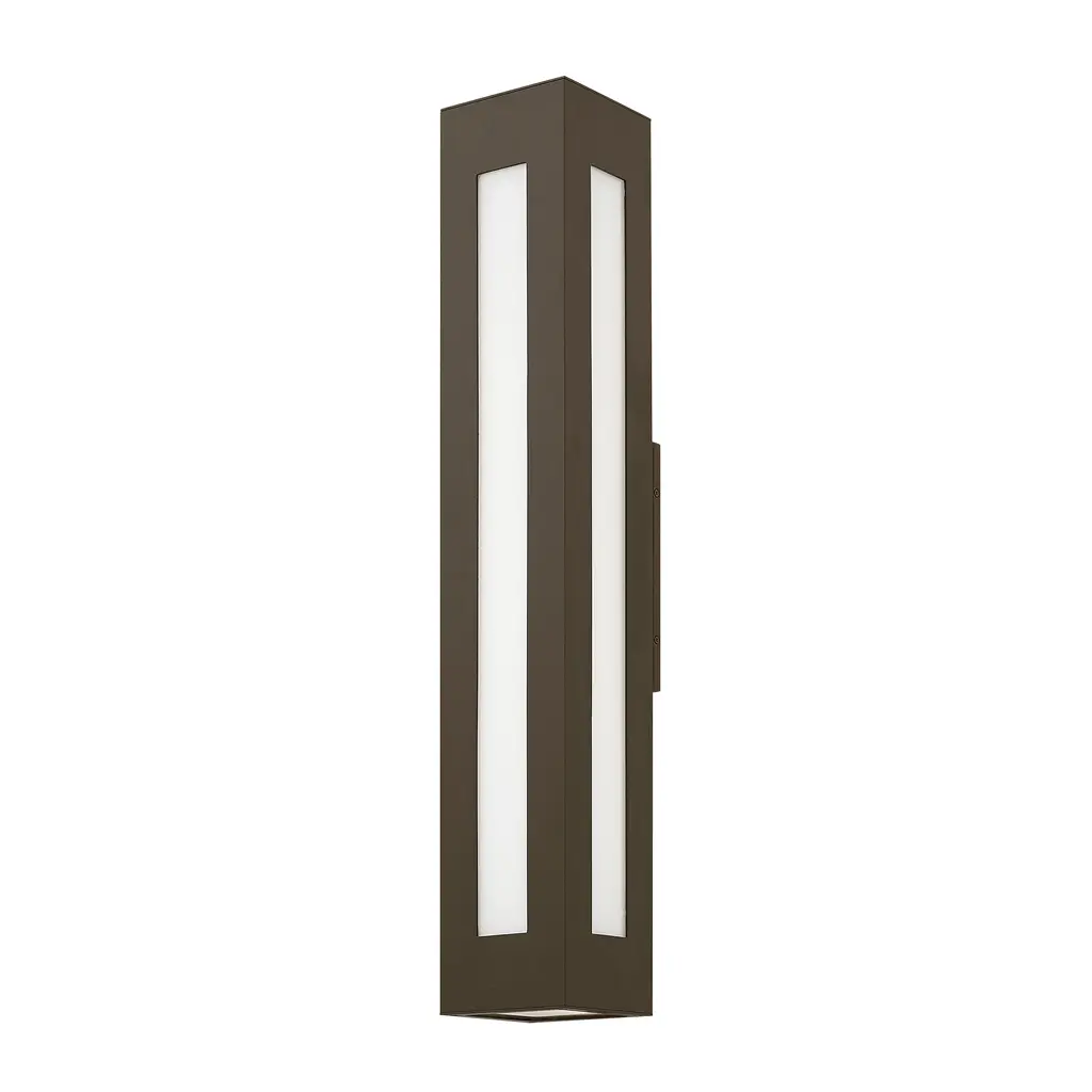 The Dorian Outdoor Wall Light from Hinkley uses a bold, angular aesthetic to bring light and contemporary flair to a home. A thick aluminum frame houses internal lamps, and five white-etched glass windows diffuse the lamp light. The minimalistic fixture is available in bronze finish. It’s wet-rated for use on your home’s exterior, where its gentle glow and handsome design can welcome guests. Features