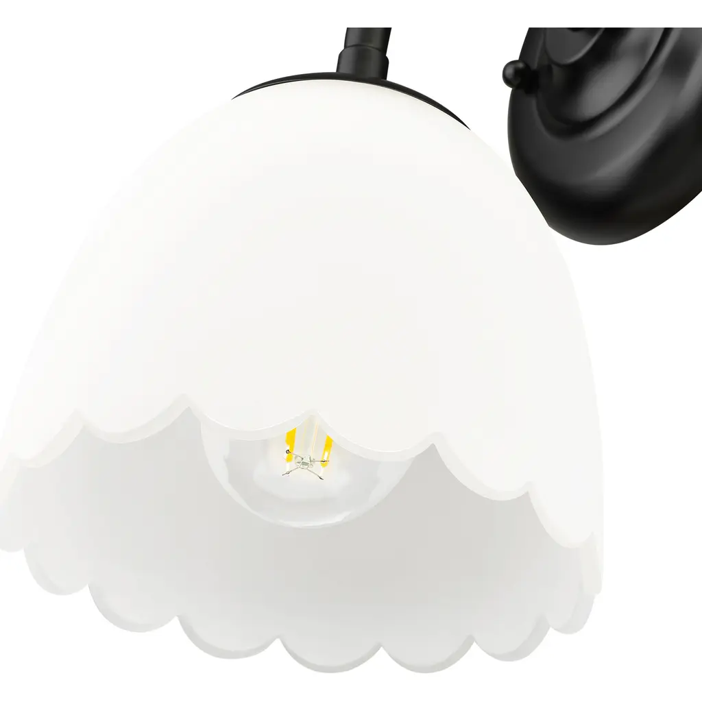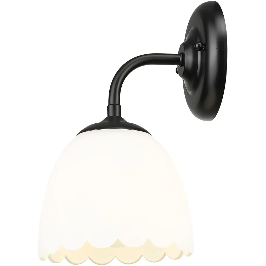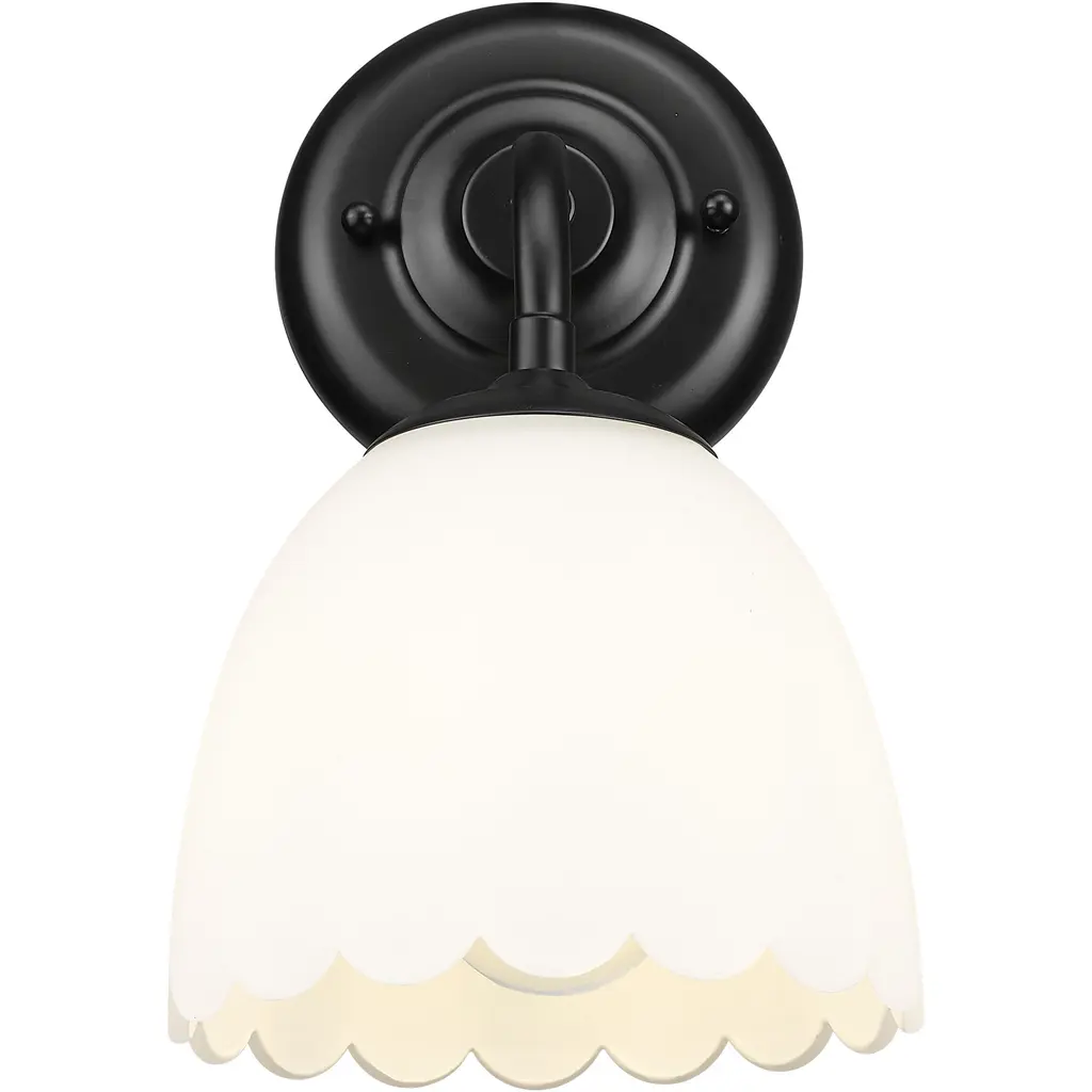 Bring modern sophistication into your home with the Golden Lighting Dorinda 1-light Wall Sconce. Featuring a glass shade and a Matte Black frame, it creates a welcoming atmosphere.The opal glass shade diffuses light evenly for a soft, glare-free glow, adding a beautiful ambiance that feels both vintage and contemporary.The Matte Black finish is timeless and versatile, offering a smooth, non-reflective surface that enhances any decor style, from minimalist to industrial.Perfect for illuminating hallways, stairways, or providing cozy ambiance in bedrooms and dining rooms, this fixture is damp location rated for use in areas with occasional moisture.Overall Dimensions: 6.5"W x 11"H x 7.5"D, requiring 1 E26 medium base bulb (not included), max 100 watts.Elevate your decor with this stylish and quality lighting option.