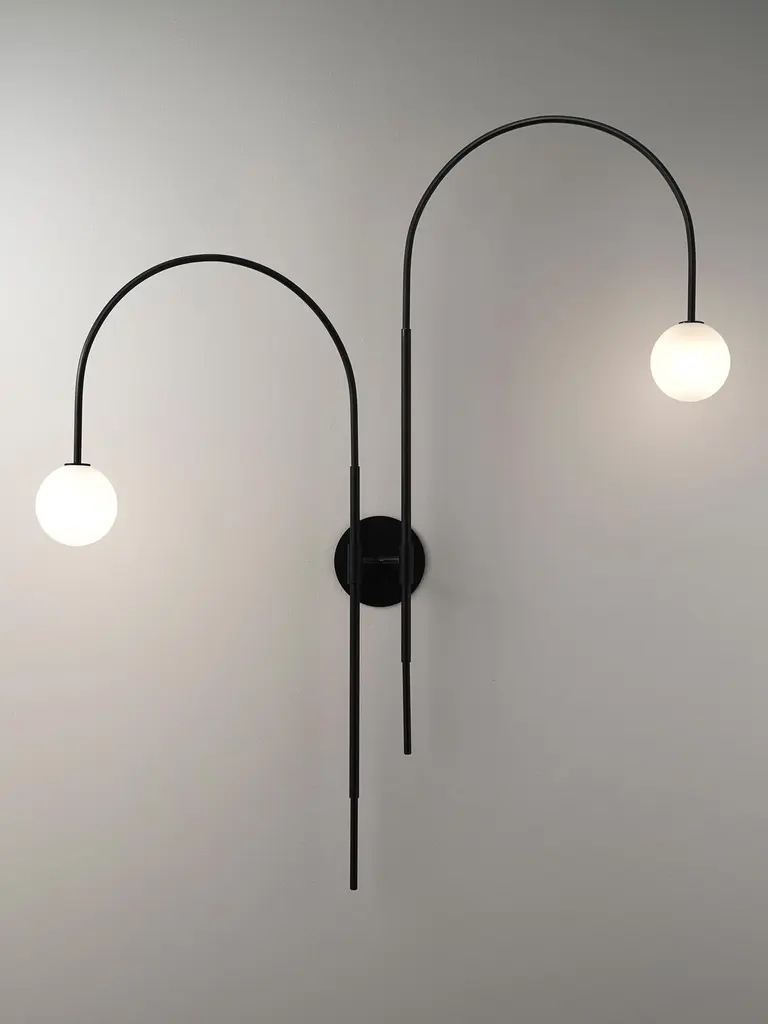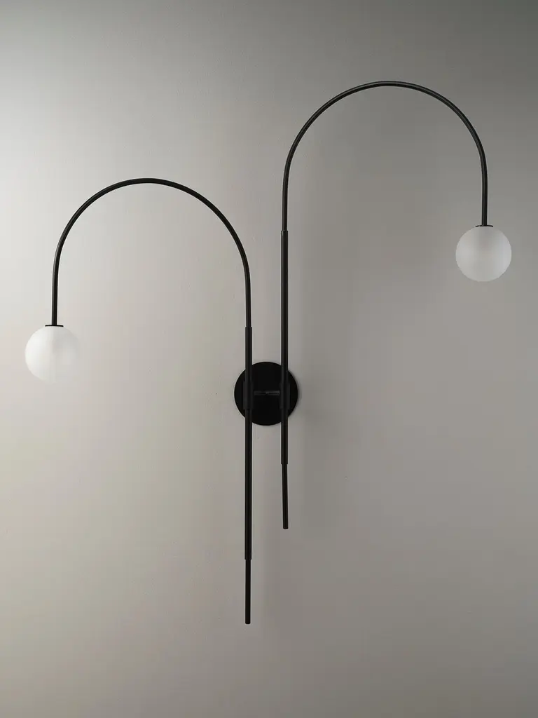 The Double Arc is a dramatically overscaled study in clean lines and simple form inspired by the tenets of the Bauhaus, ARC is truly a go-anywhere design and is equally at home in residential, commercial and hospitality projects. This fixture is especially impactful as a bedside lamp when space is at a premium! ARC is shown here in our Black enamel, but may be made in any of our 6 metal finishes or 36 enamel colors.The Double Arc builds off of the clean lines and simple forms of the standalone Arc lamp, inspired by the functionality and simplicity of Bauhaus designs.DIMENSIONS40" H X 36" W X 8" D. Blown opal galss globe is 6" diameter. Backplate is 4.75" diameter and covers a standard wall junction box. SPECIFICATIONSUses two (2) G9 socket bulbs (halogen-style socket with 2 pins). We recommend G9 LED bulbs in a T4 shape: 5w LED with 60 watt equivalent. Dimmable.