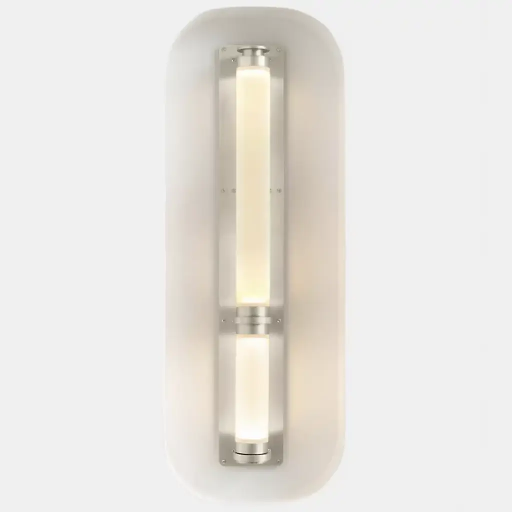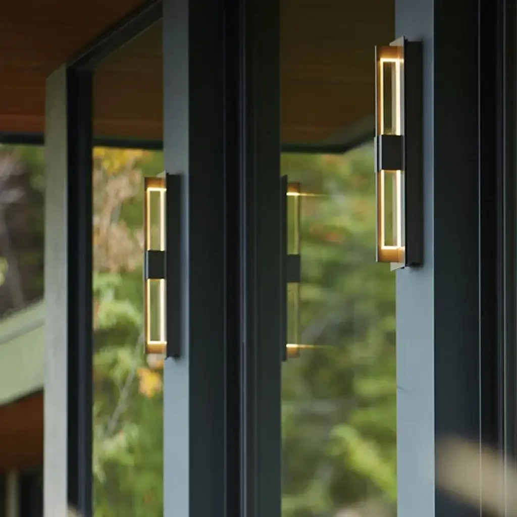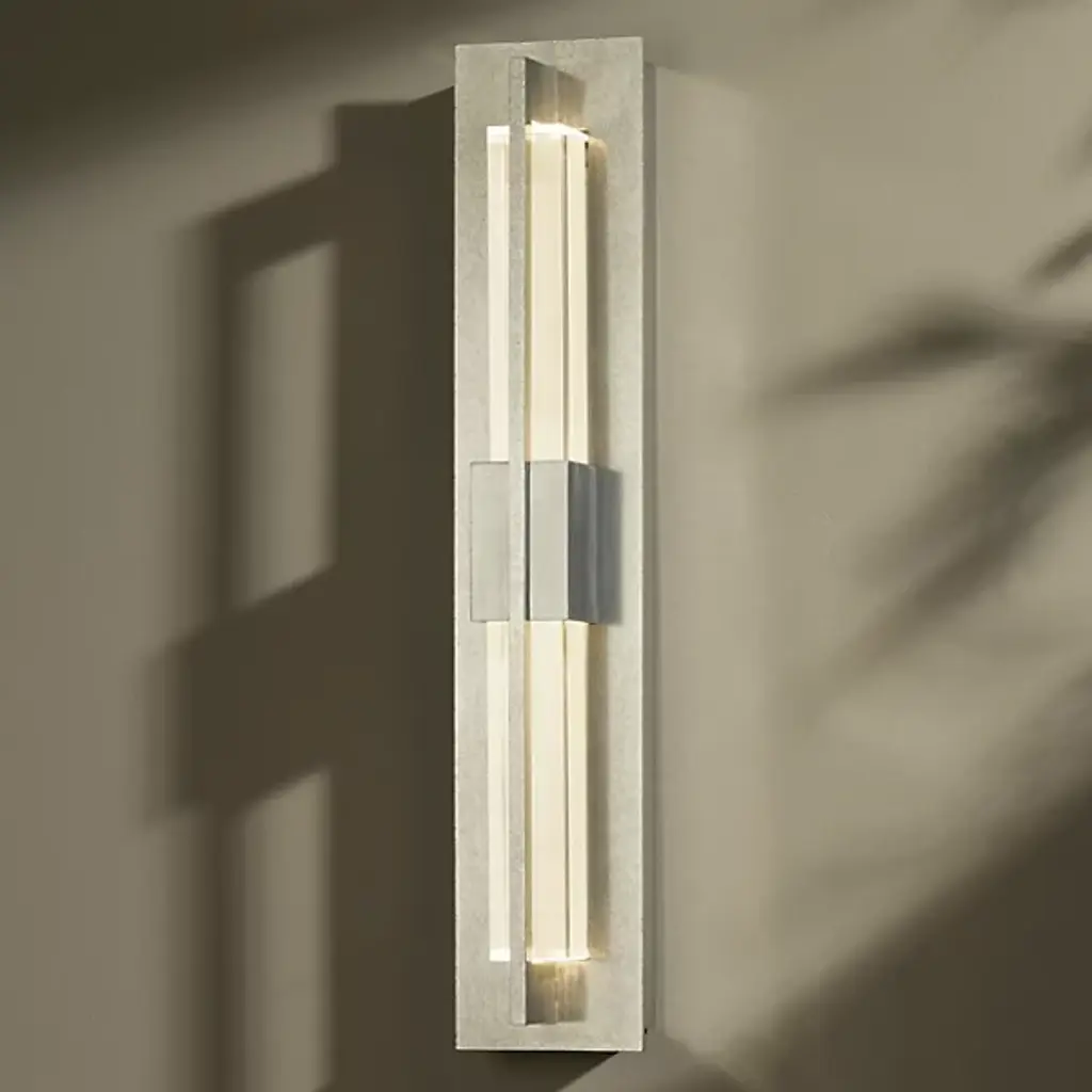 The Hubbardton Forge Double Axis LED Wall Sconce has doubled down on elegant, symmetrical style. Two rectangular Clear glass block shades are bisected with a slender strip of aluminum that both anchors the glass and provides a central focal point. A flat, rectangular wall plate complements the glass blocks' shape and subtly shines with a polished lustrous finish.