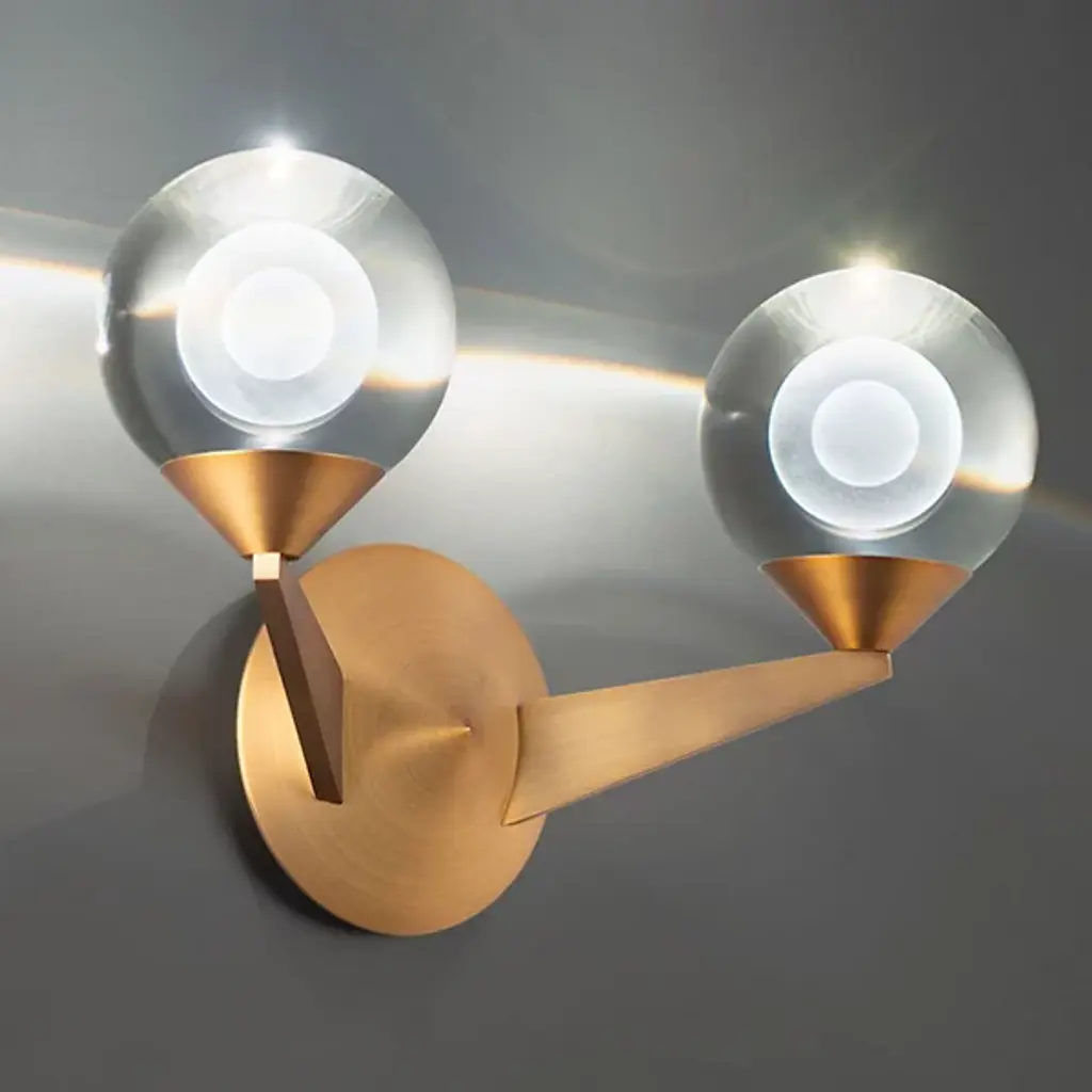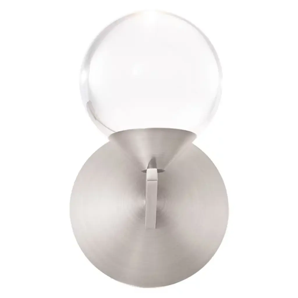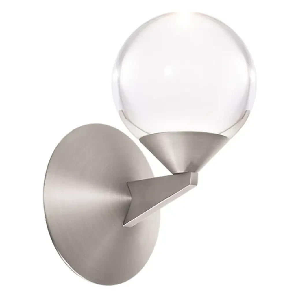 Decorate your living space with the minimal, abstract, Double Bubble LED Wall Sconce by Modern Forms. Held with a fine, metal framework, your sconce's alluring visual effect is one of a larger orb possessing a smaller sphere. Elegant luminosity is diffused through the laser-etched crystal orb. Mount upwards or downwards, depending on your desired look and application.