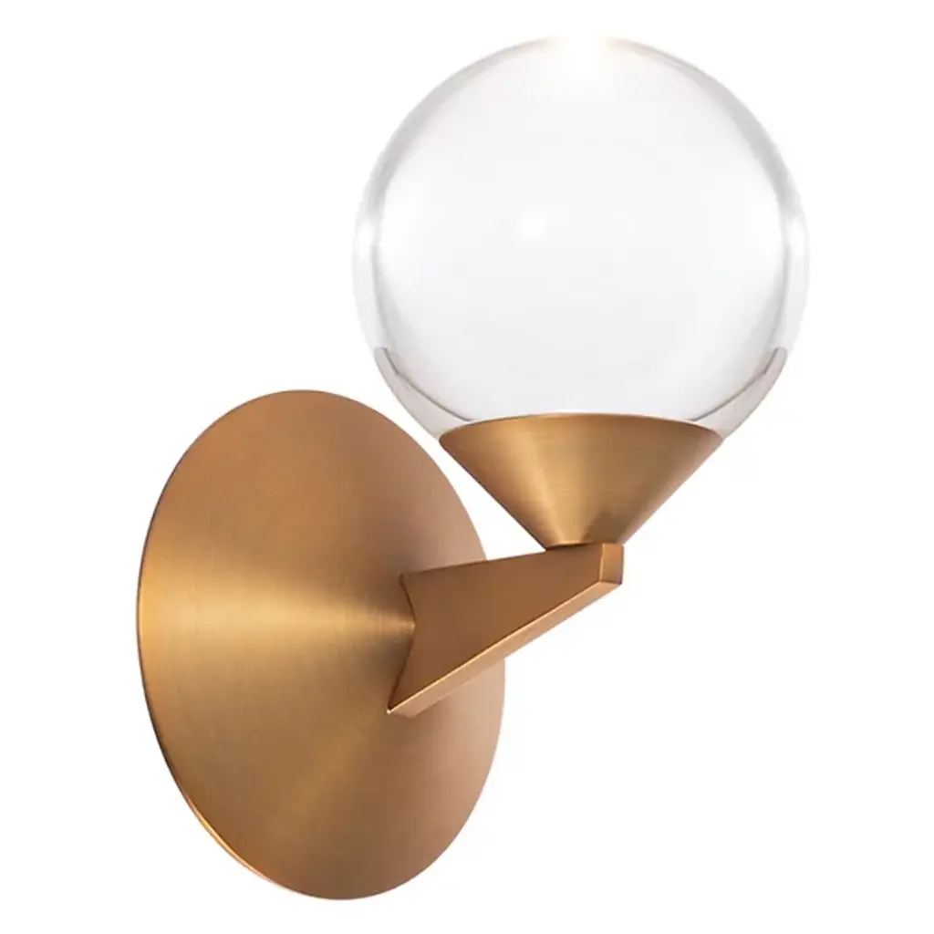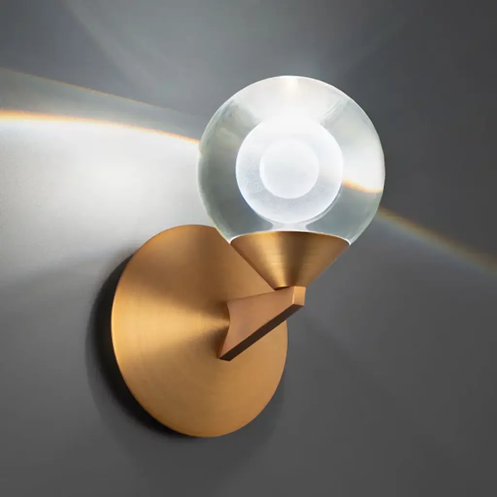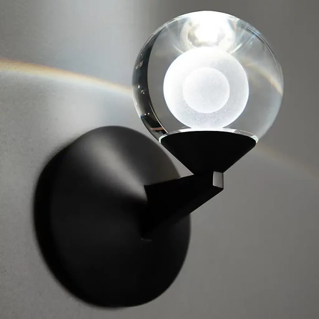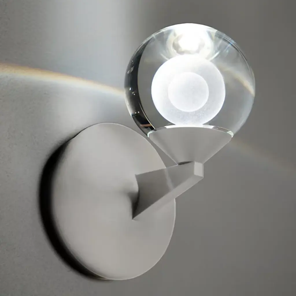 Decorate your living space with the minimal, abstract, Double Bubble LED Wall Sconce by Modern Forms. Held with a fine, metal framework, your sconce's alluring visual effect is one of a larger orb possessing a smaller sphere. Elegant luminosity is diffused through the laser-etched crystal orb. Mount upwards or downwards, depending on your desired look and application.