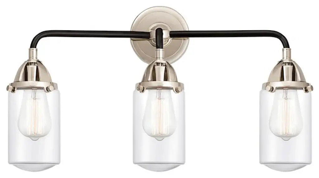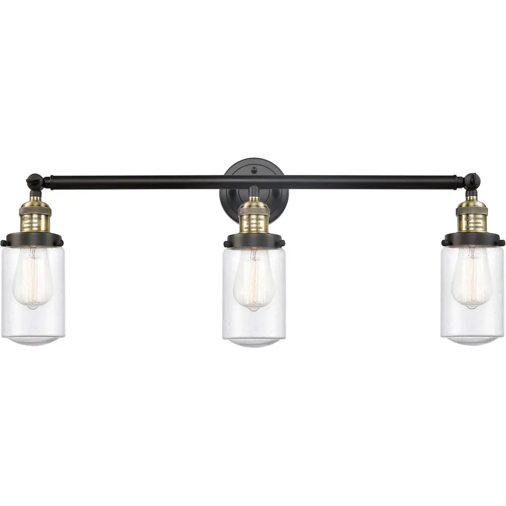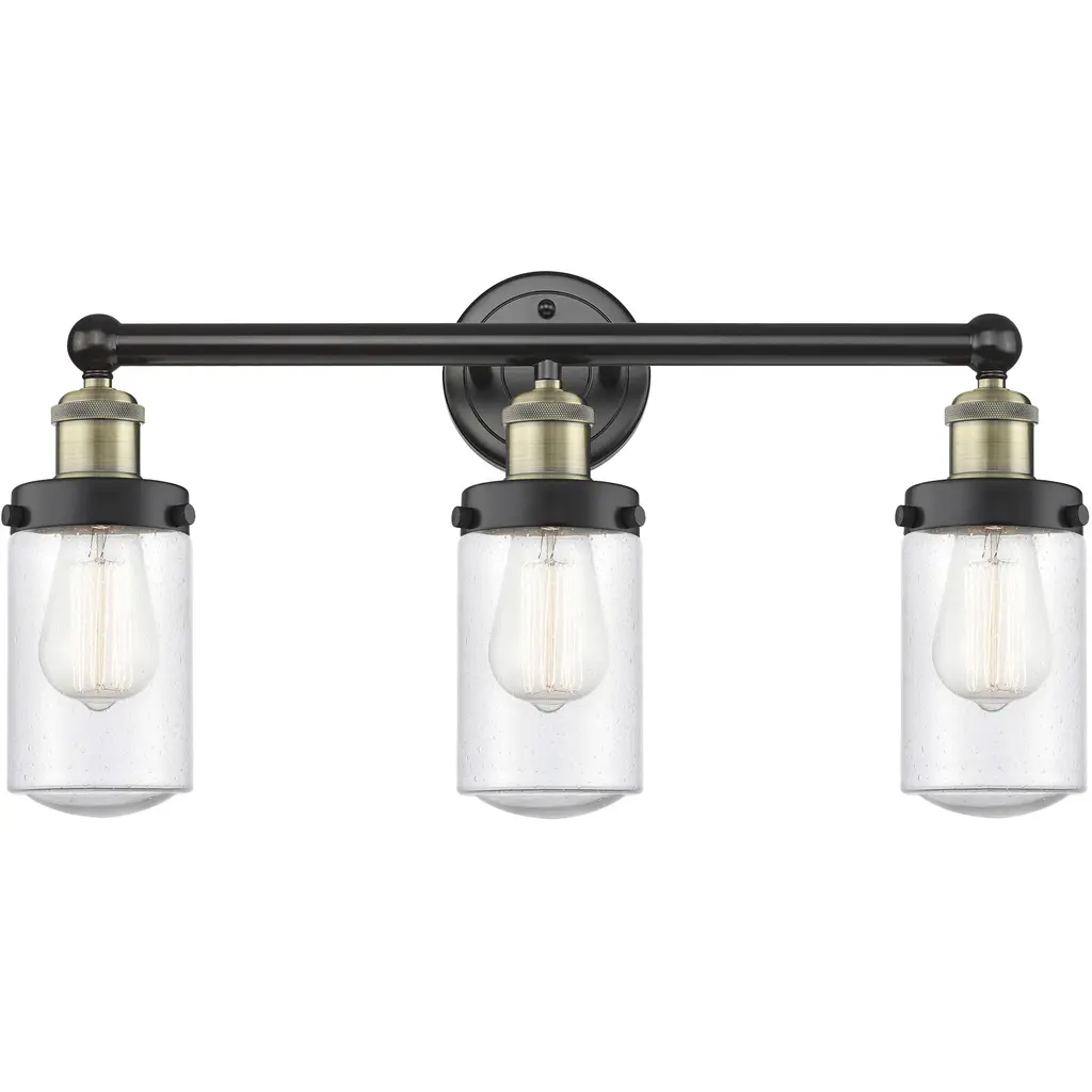 INNOVATIONS 616-3W-BAB-G311 Dover 3 24.5 inch Bath Vanity Light Black Antique Brass. Style: Art Nouveau, Industrial, Restoration-Vintage, Transitional . Collection Name: Edison. Metal Finish(Body): Black Antique Brass. Metal Finish(Canopy/Backplate): Matte Black. Material: Steel, Cast Brass, Glass. Dimension(in): 11.875(H) x 22.5(W) x 6.75(Ext). Bulb: (3)60W Medium Base Incandescent(Not Included). Voltage: 120. Dimmable: Yes. Color Temperature (Kelvin): 2200. Color Rendering Index (CRI): 99.9. Lumens: 220. Life Expectancy (Hours): 2000. Glass Shade Description: Matte White Cased Dover. Glass Type: Frosted. Shade Shape: Cylinder. Glass or Metal Shade Color: Matte White. Shade Material: Glass. Shade Dimension(in): 4.5(W) x 6.625(H). Fitter Measurement (Glass Or Metal Shade Fitter Size): 3.25 inch Fitter. Backplate Dimension(in): 4.5(W) x 0.75(Depth). ADA Compliant: No. California Proposition 65 Warning Required: Yes. UL/ETL Certification Type: Damp Location.