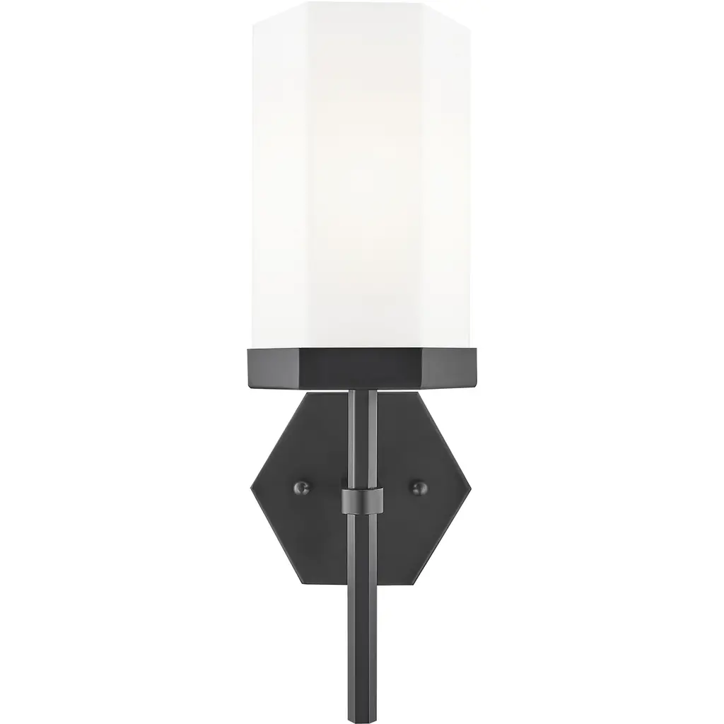 A sophisticated blend of geometry and modern design, this collection features 8" and 12" hexagonal glass shades set within sleek hexagonal metal holders. The polished stem and tail detail, along with a matching hexagonal backplate, create a cohesive design thats perfect for adding a contemporary flair to any space.