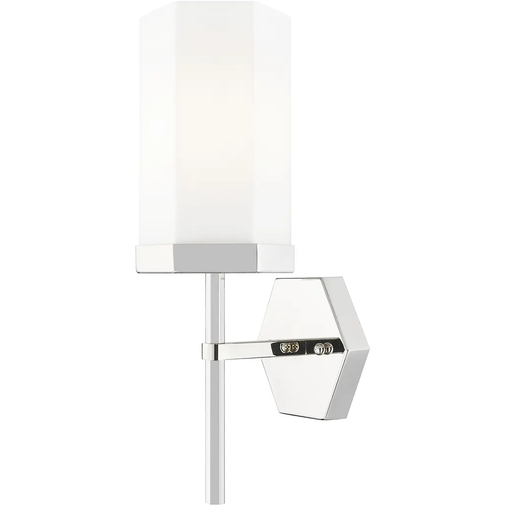 A sophisticated blend of geometry and modern design, this collection features 8" and 12" hexagonal glass shades set within sleek hexagonal metal holders. The polished stem and tail detail, along with a matching hexagonal backplate, create a cohesive design thats perfect for adding a contemporary flair to any space.