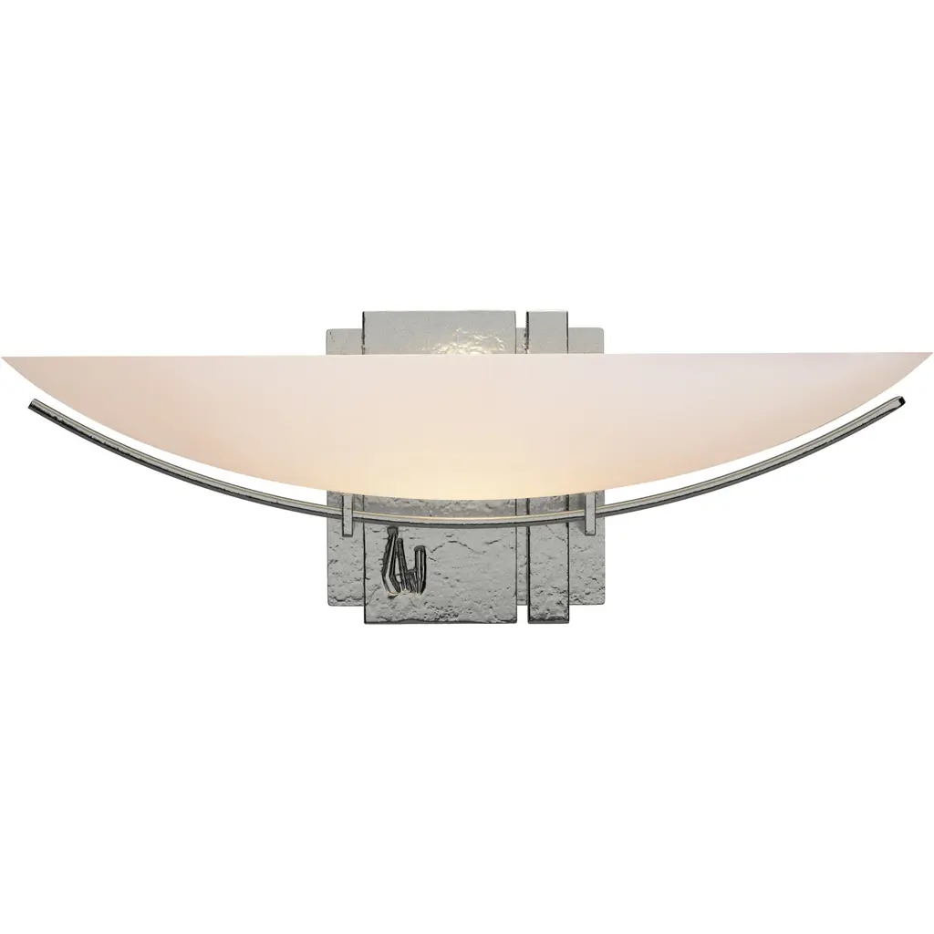 Like the pages of a book, the eyes scan from side to side with the dramatic lines of the Dozza Horizontal LED Wall Sconce from Huxe. The sconce's tight design is perfect across hallways or over a column. It creates the illusion of floating through a hidden mounting plate. Coming forward, an opal acrylic shade keeps the LEDs away from sight with a glare-reducing curve. The smooth and light shade focuses on the textured and robust metal band in front. Protruding accents on the band evoke modern industrial design. Once turned on, the sconce eases a calm cast glow over the wall vertically.