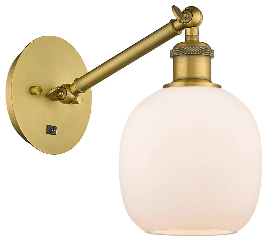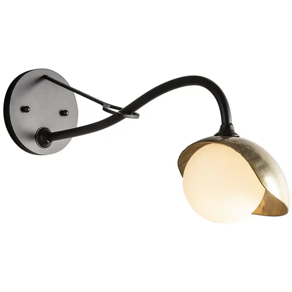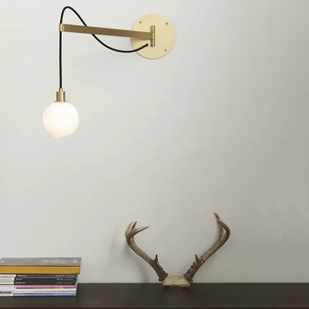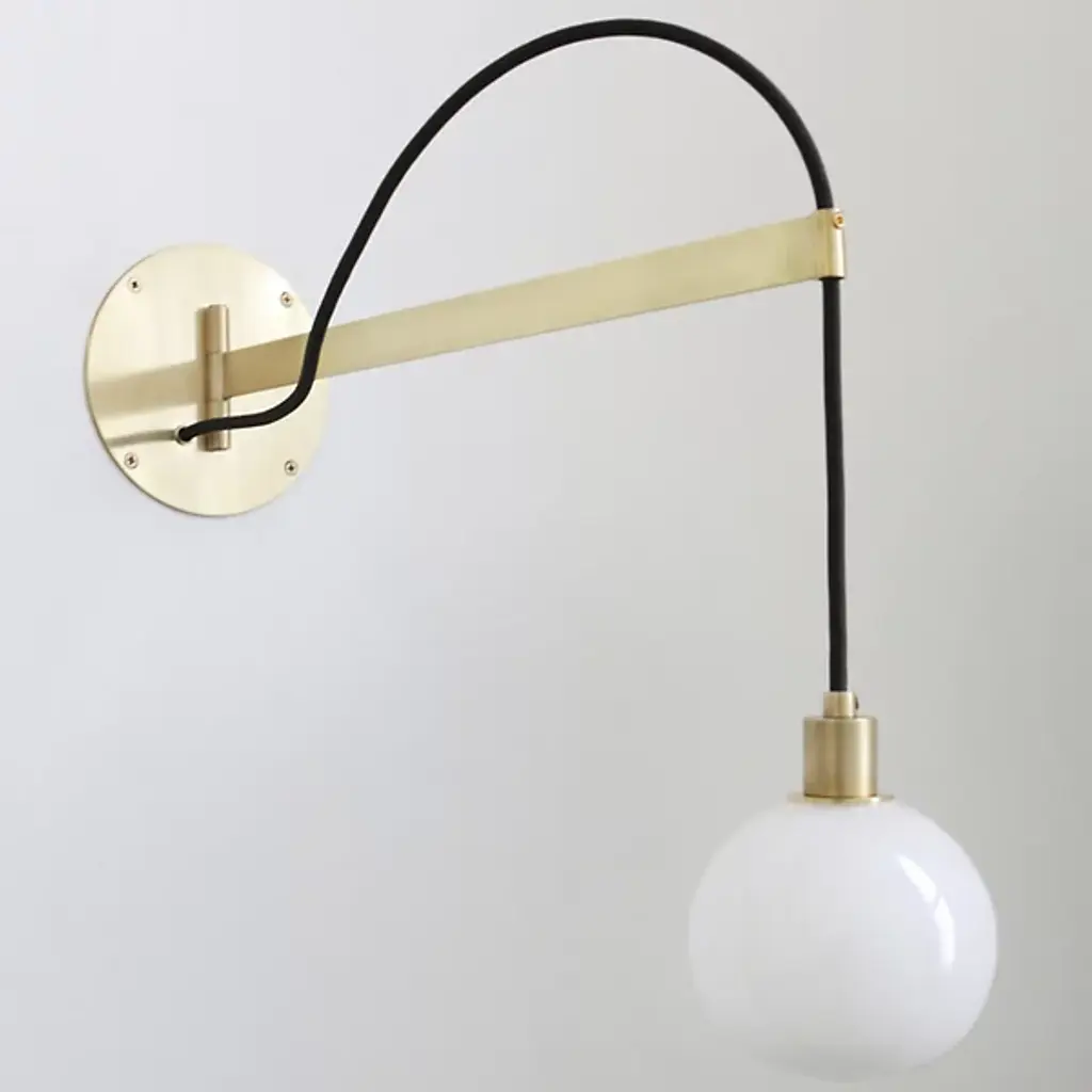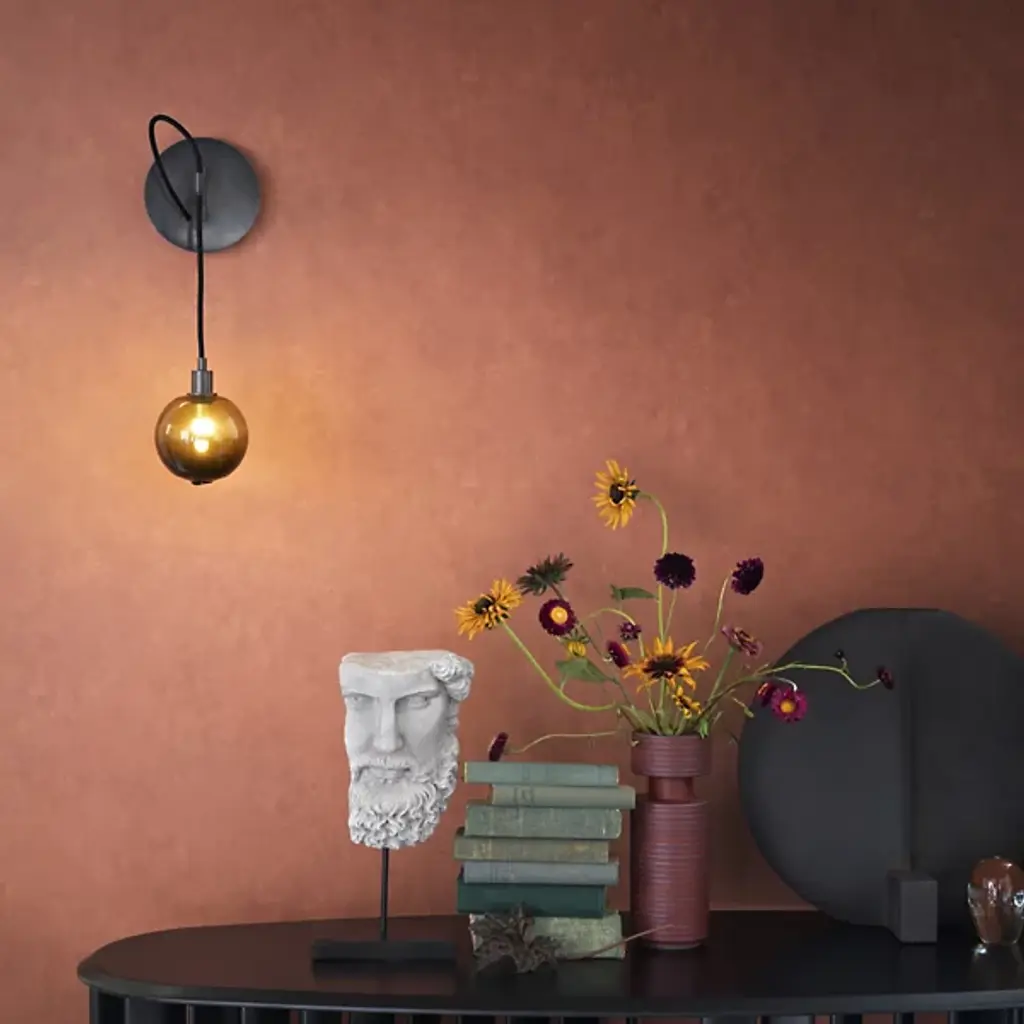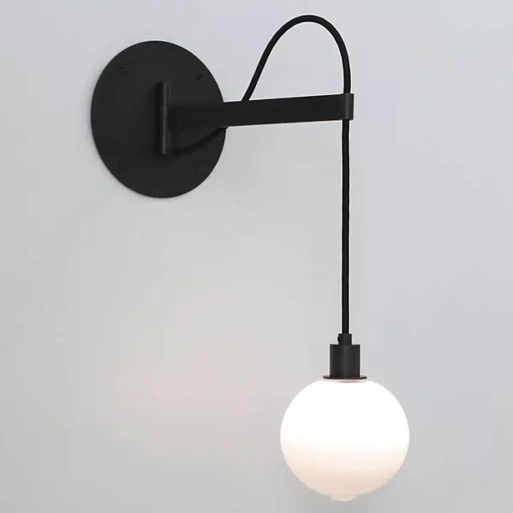 The Drape Wall Sconce by SkLO is a striking and modern piece from designer duo Karen Gilbert and Paul Pavlak. Focused on the skill and tradition of handblown Czech glasswork, the designers created a minimal fixture showcasing a natural hand-formed sphere held at the end of a fabric-wrapped cord. A disc-shaped wall mount anchors the piece to the wall while sending an arm forward for the cord to thread through, adding structure to the softness of its composition.