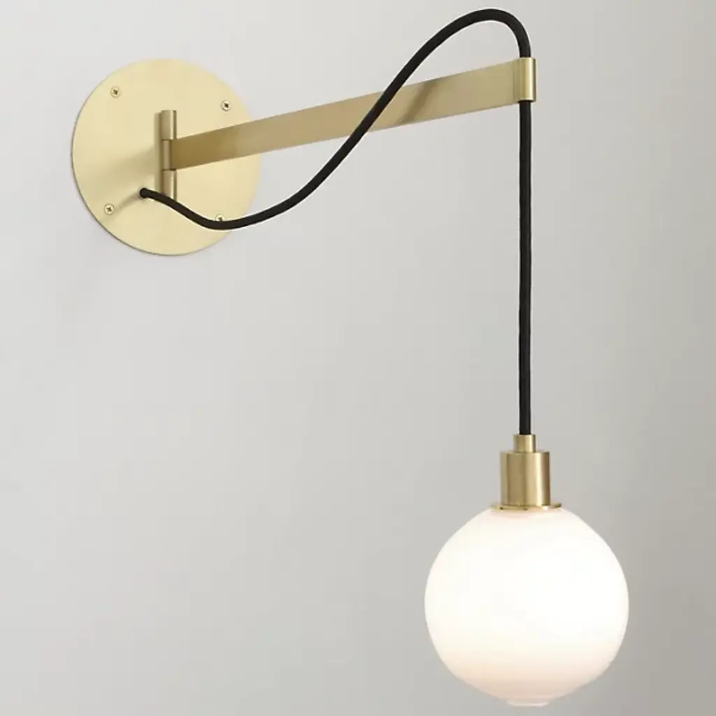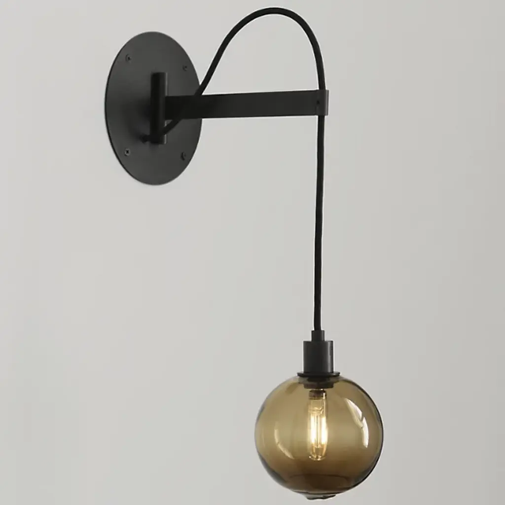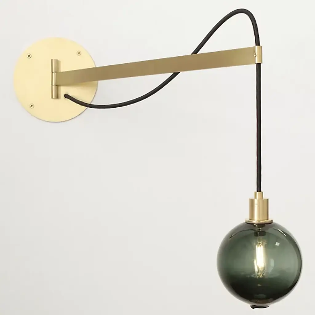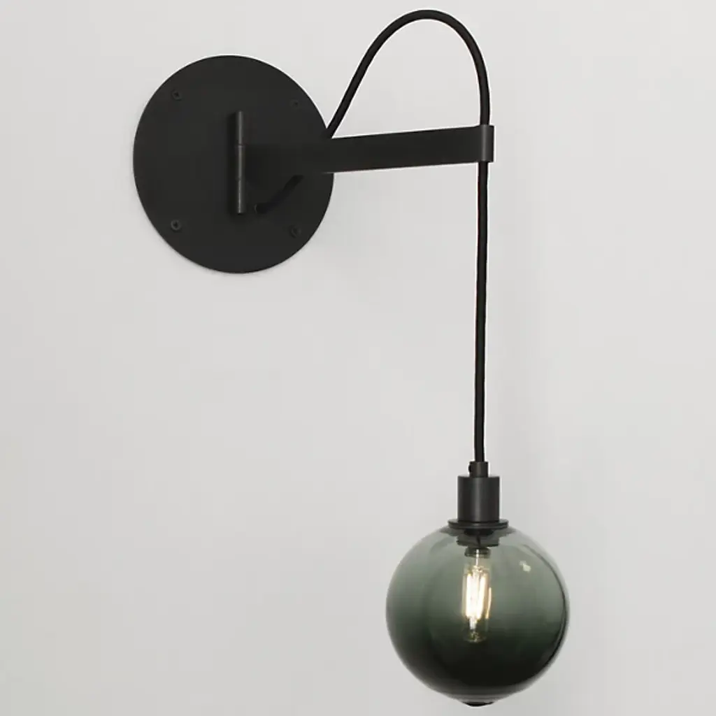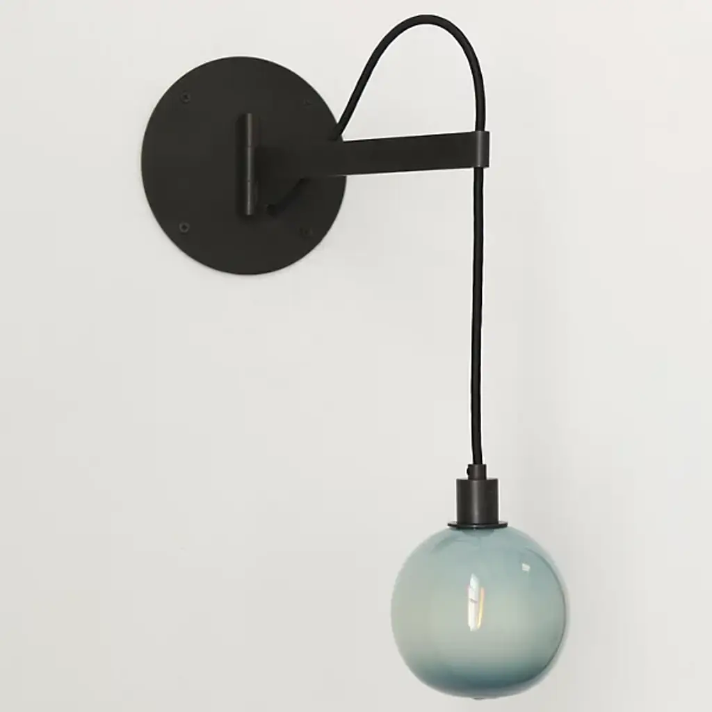 The Drape Wall Sconce by SkLO is a striking and modern piece from designer duo Karen Gilbert and Paul Pavlak. Focused on the skill and tradition of handblown Czech glasswork, the designers created a minimal fixture showcasing a natural hand-formed sphere held at the end of a fabric-wrapped cord. A disc-shaped wall mount anchors the piece to the wall while sending an arm forward for the cord to thread through, adding structure to the softness of its composition.