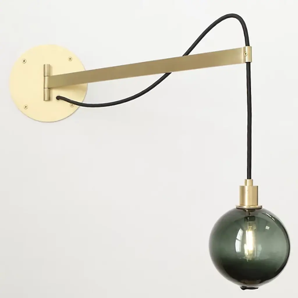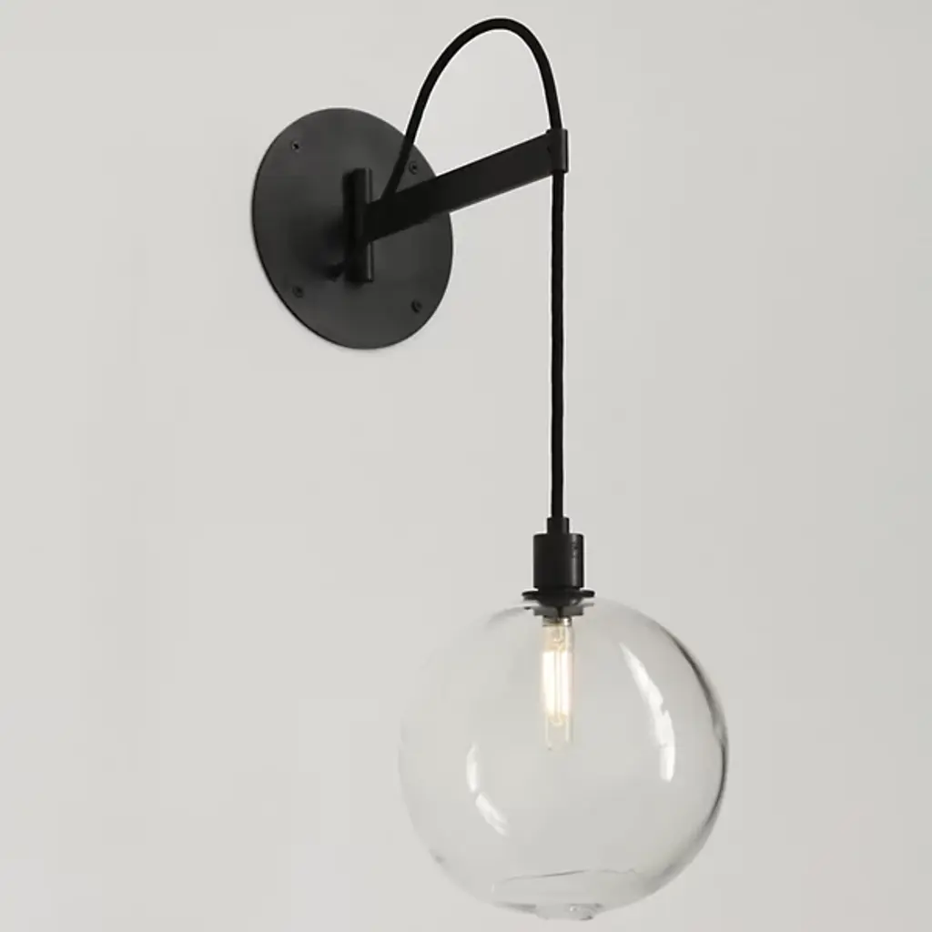 The Drape Wall Sconce by SkLO is a striking and modern piece from designer duo Karen Gilbert and Paul Pavlak. Focused on the skill and tradition of handblown Czech glasswork, the designers created a minimal fixture showcasing a natural hand-formed sphere held at the end of a fabric-wrapped cord. A disc-shaped wall mount anchors the piece to the wall while sending an arm forward for the cord to thread through, adding structure to the softness of its composition.