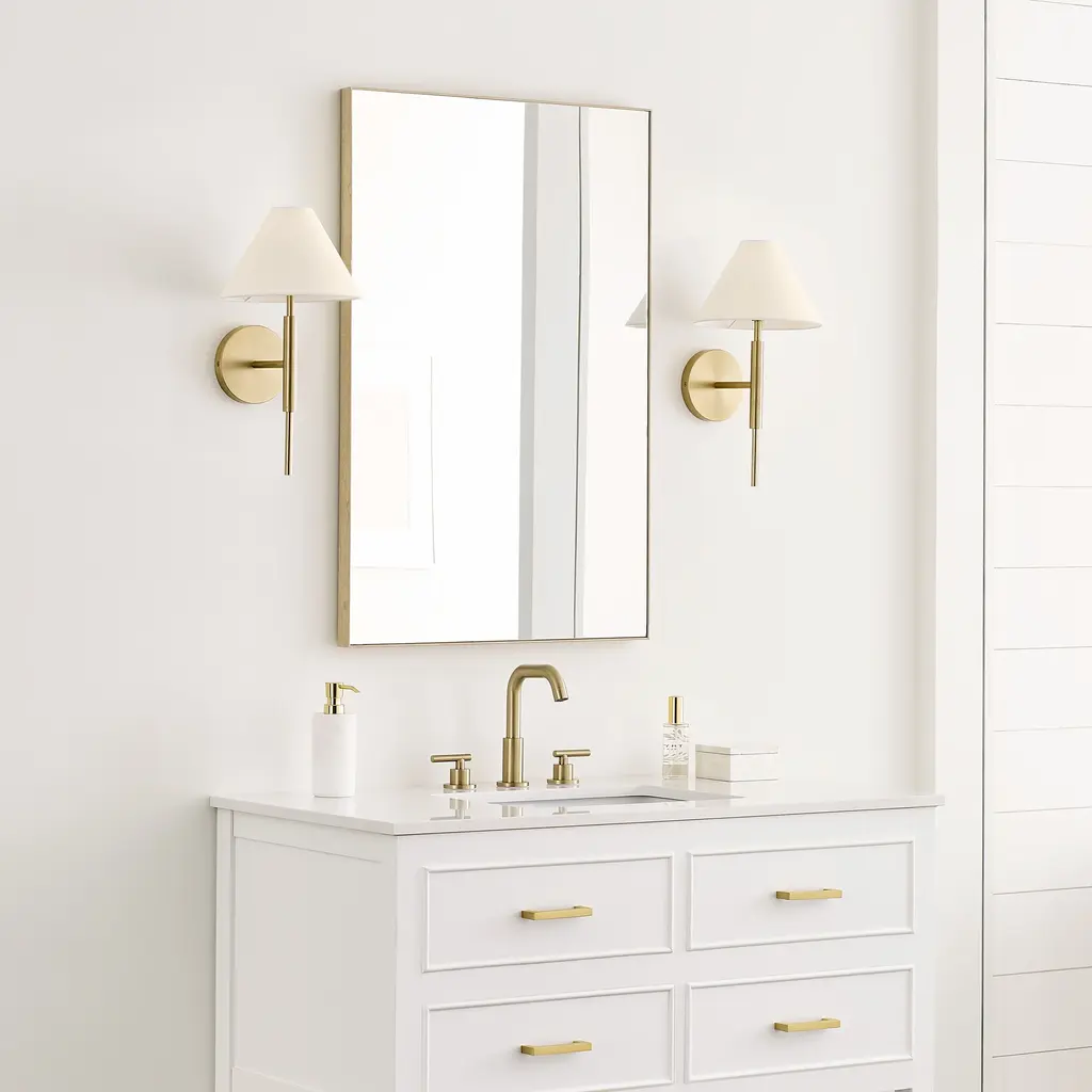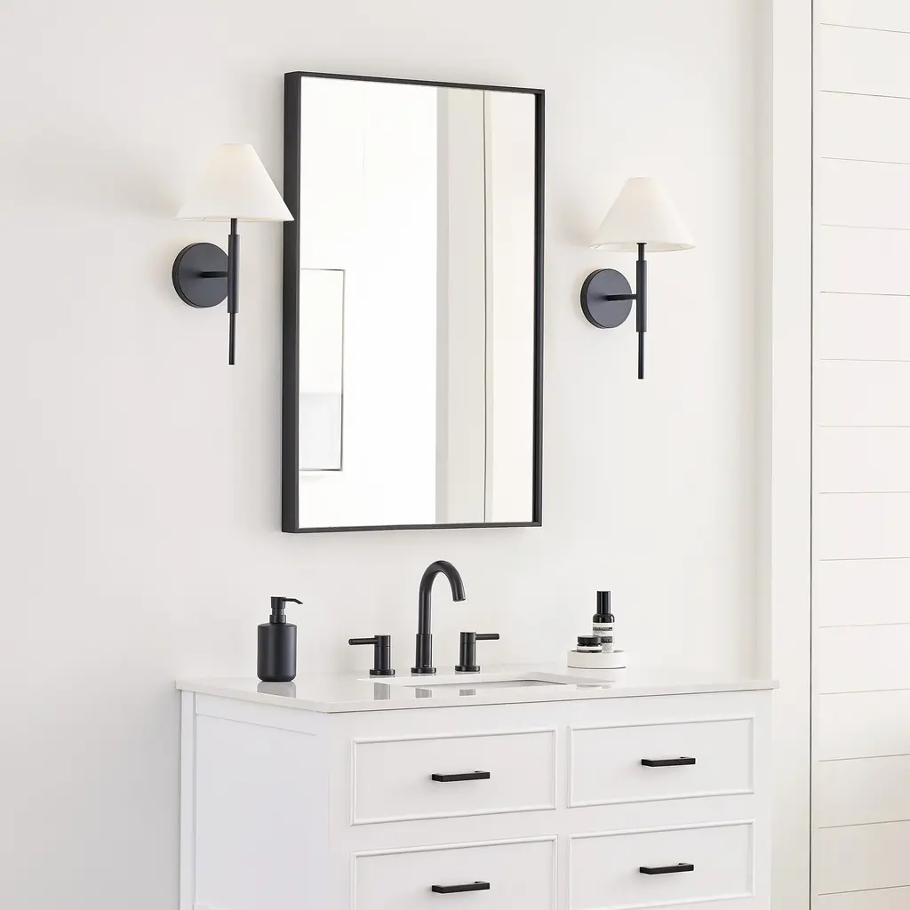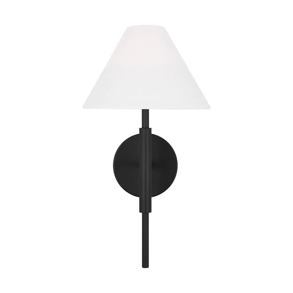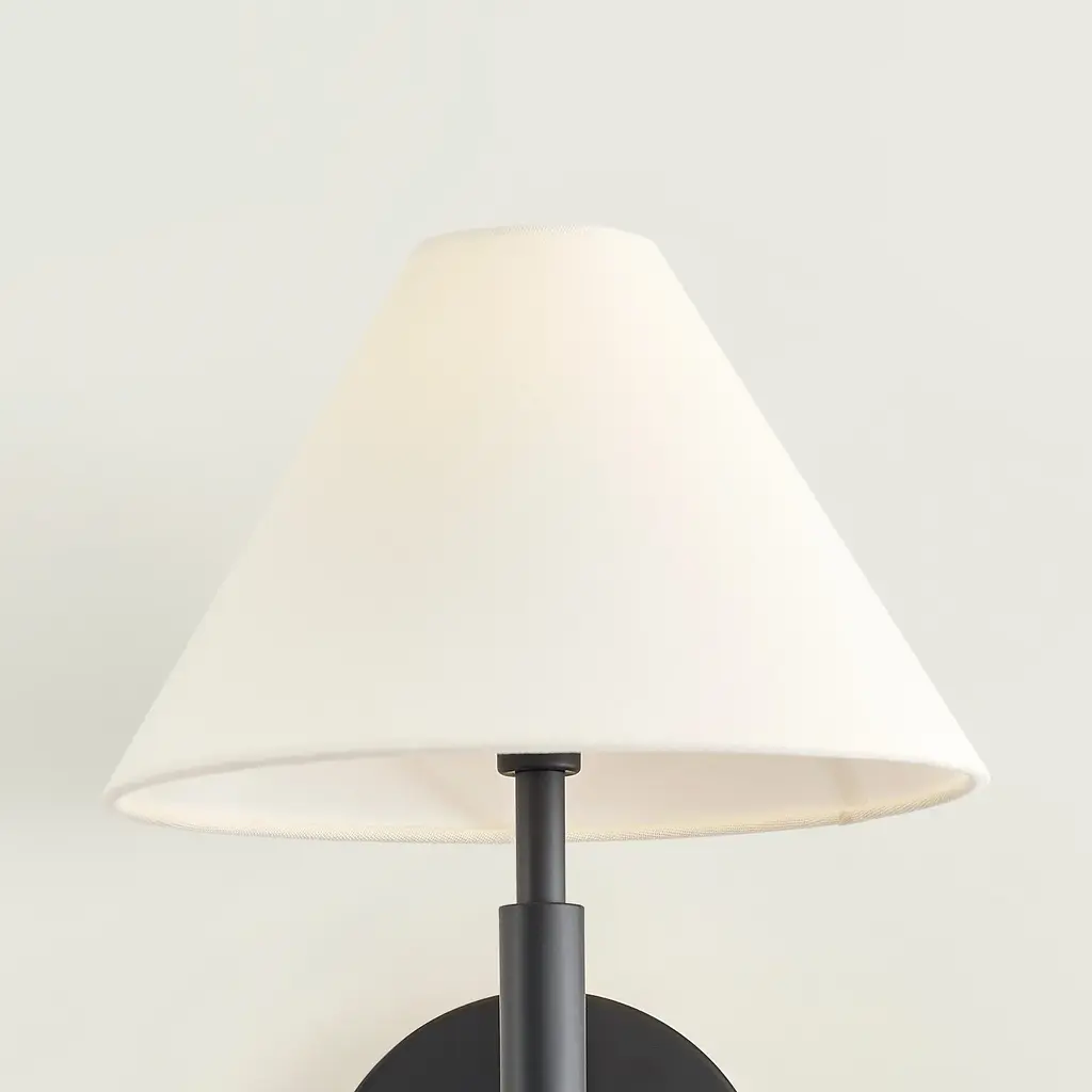 The Drew and Jonathan Porteau Wall Sconce from Visual Comfort & Co features a white linen empire shade that casts a soft, inviting glow. Its slim metal arm and circular backplate create a modern, sophisticated profile, available in Satin Brass or Midnight Black finishes. Damp-rated for use in bathrooms or hallways, this sconce seamlessly combines elegant design with practical versatility, adding a refined touch to any space. Highlights