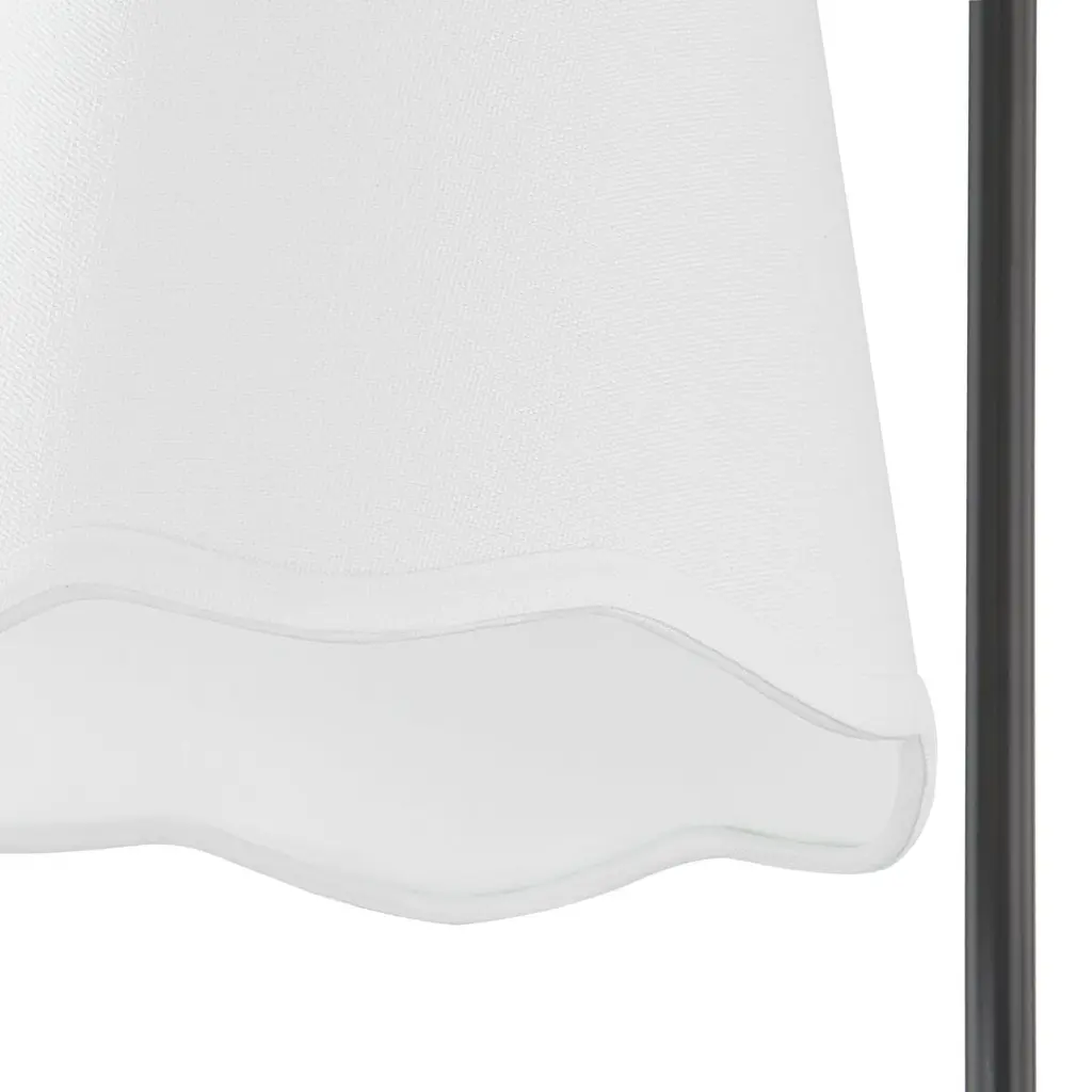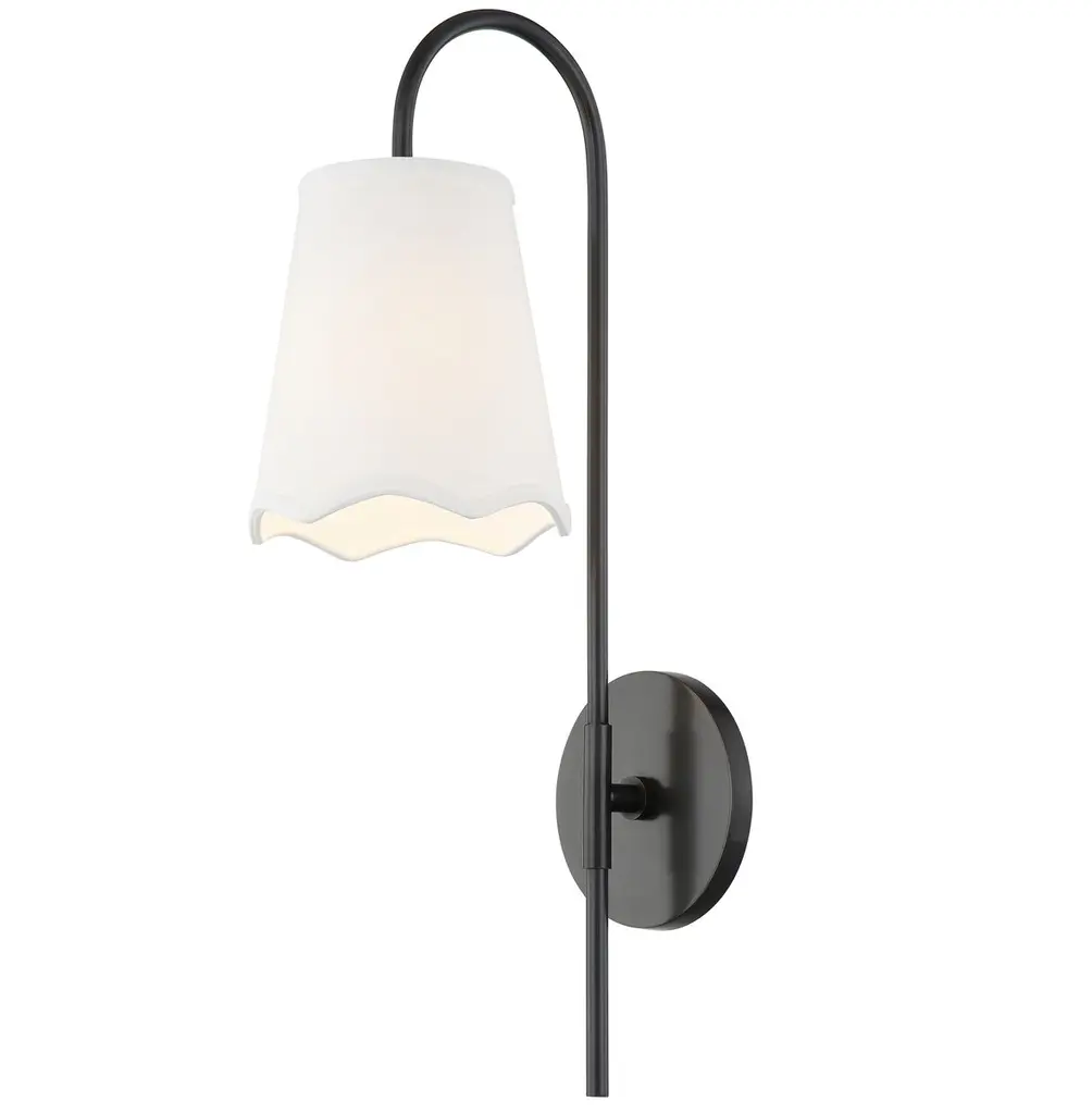 The scalloped edges of the white linen shade bring a dash of whimsy to this sleek contemporary sconce. Because the sconce is damp rated, you can use it in a bathroom as well as beside a bed, in a foyer, or just about anywhere else in your home.