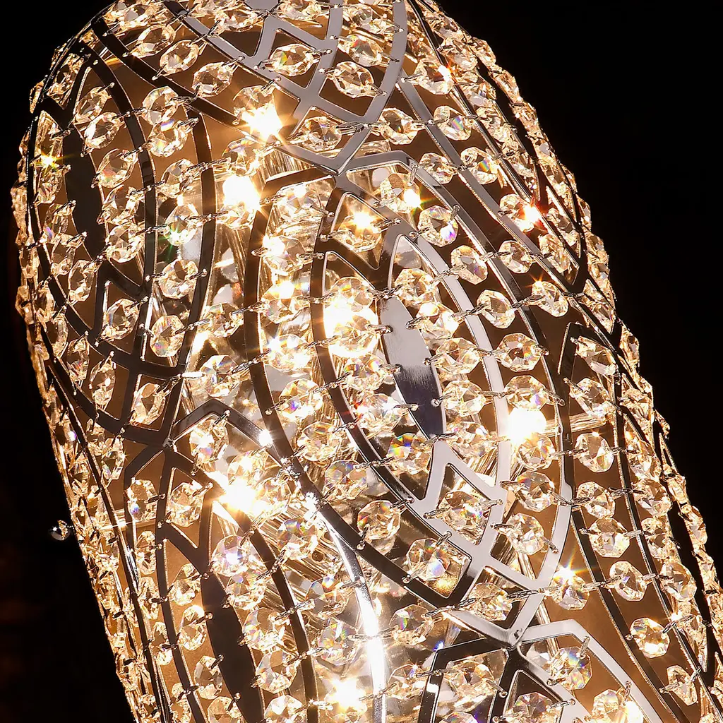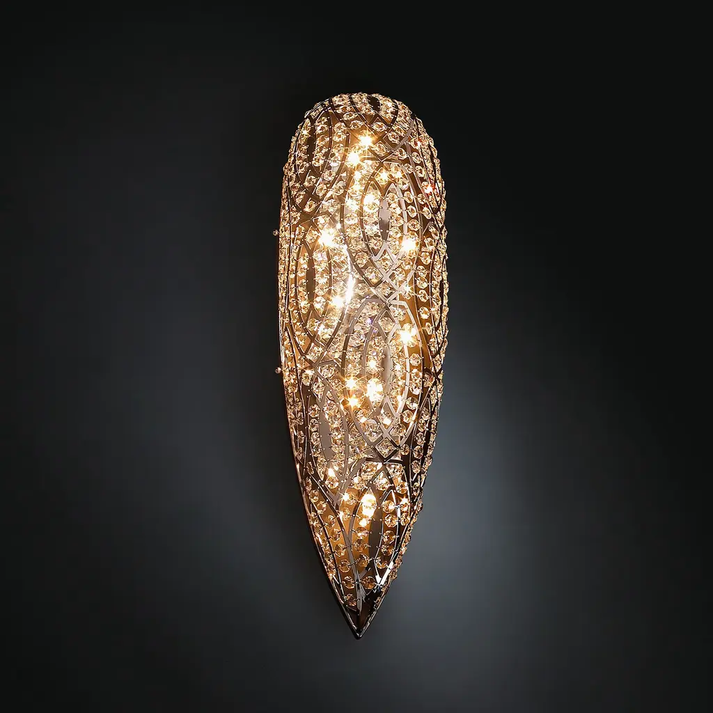 This upside-down drop of light will shine on a modern wall, either in pair flanking a sofa, a bed, or a mirror or in multiples to enliven a hallway. Its mesmerizing design is made up of a series of glossy chrome-finished steel elements that were welded together to obtain a sinuous shape. A series of multi-faceted crystals that were hand applied completes this piece that contains eight LED G9 3W bulbs. The size and metal finish can be changed upon request, please contact the Concierge for details.
