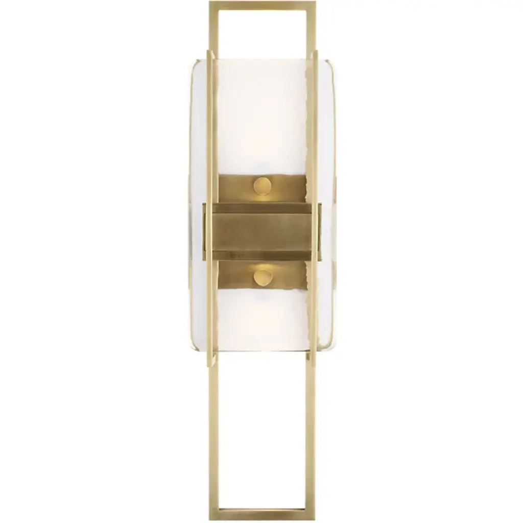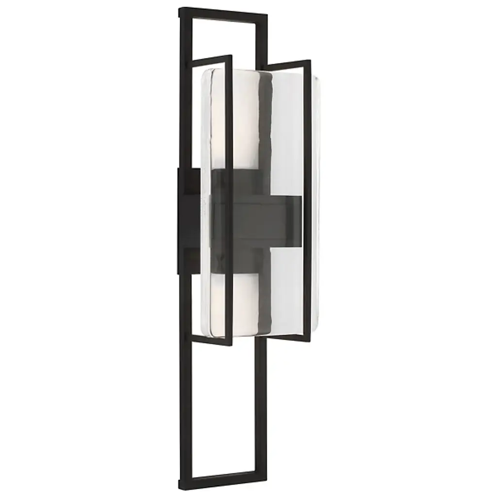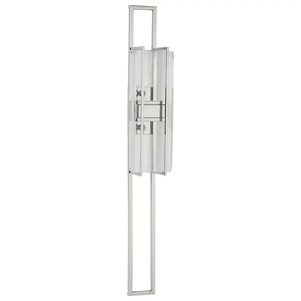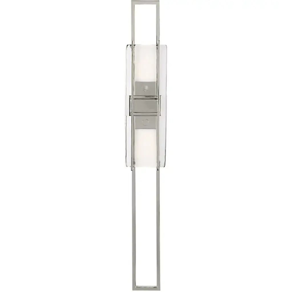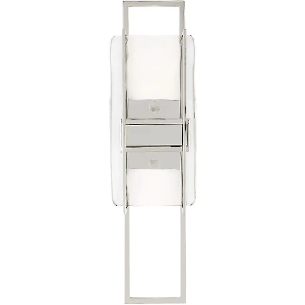 Line up picture frames or architectural features with the elegant, streaking design of the Duelle Tall Wall Sconce from Mick de Giulio for Visual Comfort Modern, formerly known as Tech Lighting, The piece rests at a low profile against the wall with a rectangular plate. In front, a square housing conceals the potent LED lamping to showcase the sconce's graphic silhouette. Slender, horizontal metal frames give the piece an attractive edge and airy feel. Slotting in between, a rectangular pane of clear, pressed glass diffuses glare from the front. The LED light casts an ambient glow on the wall and glazes the glass to enhance its artisanal texture.