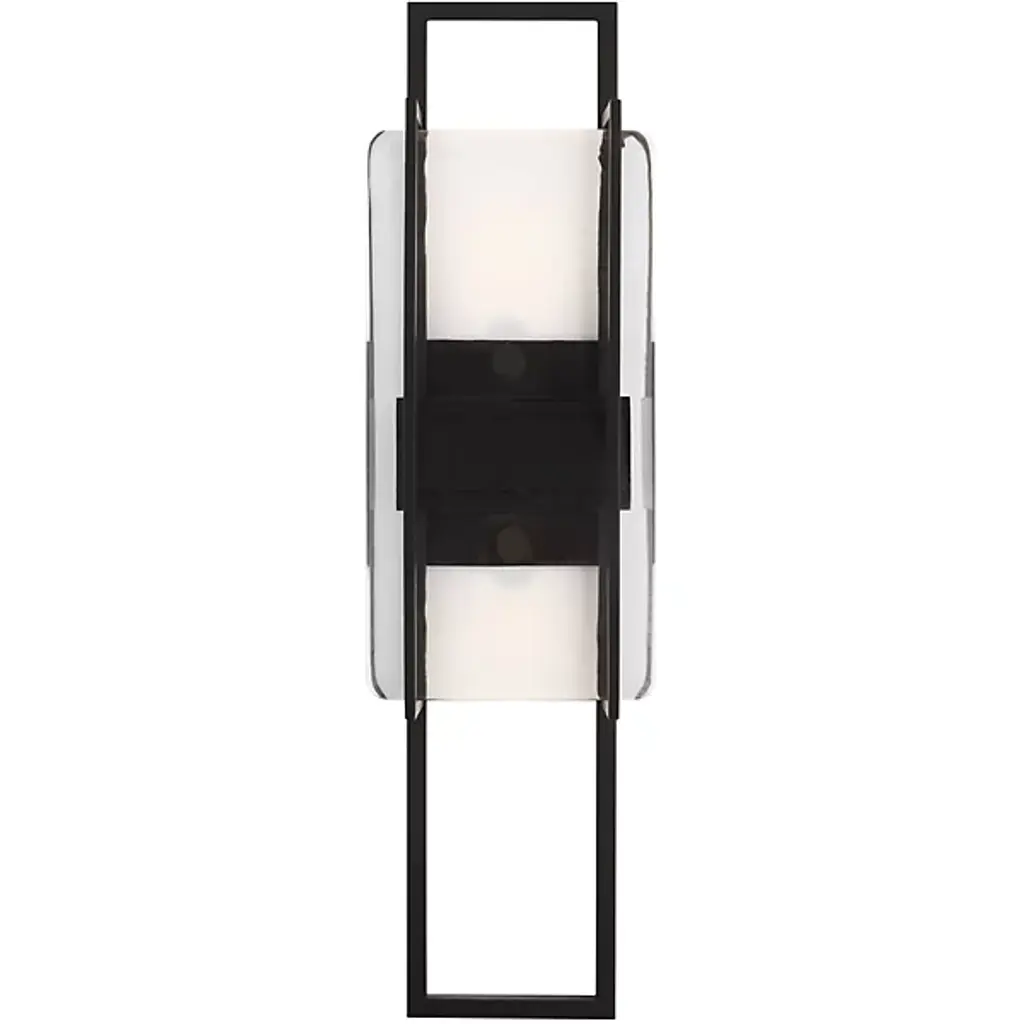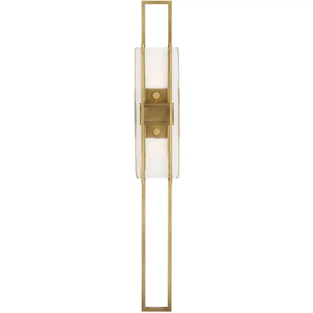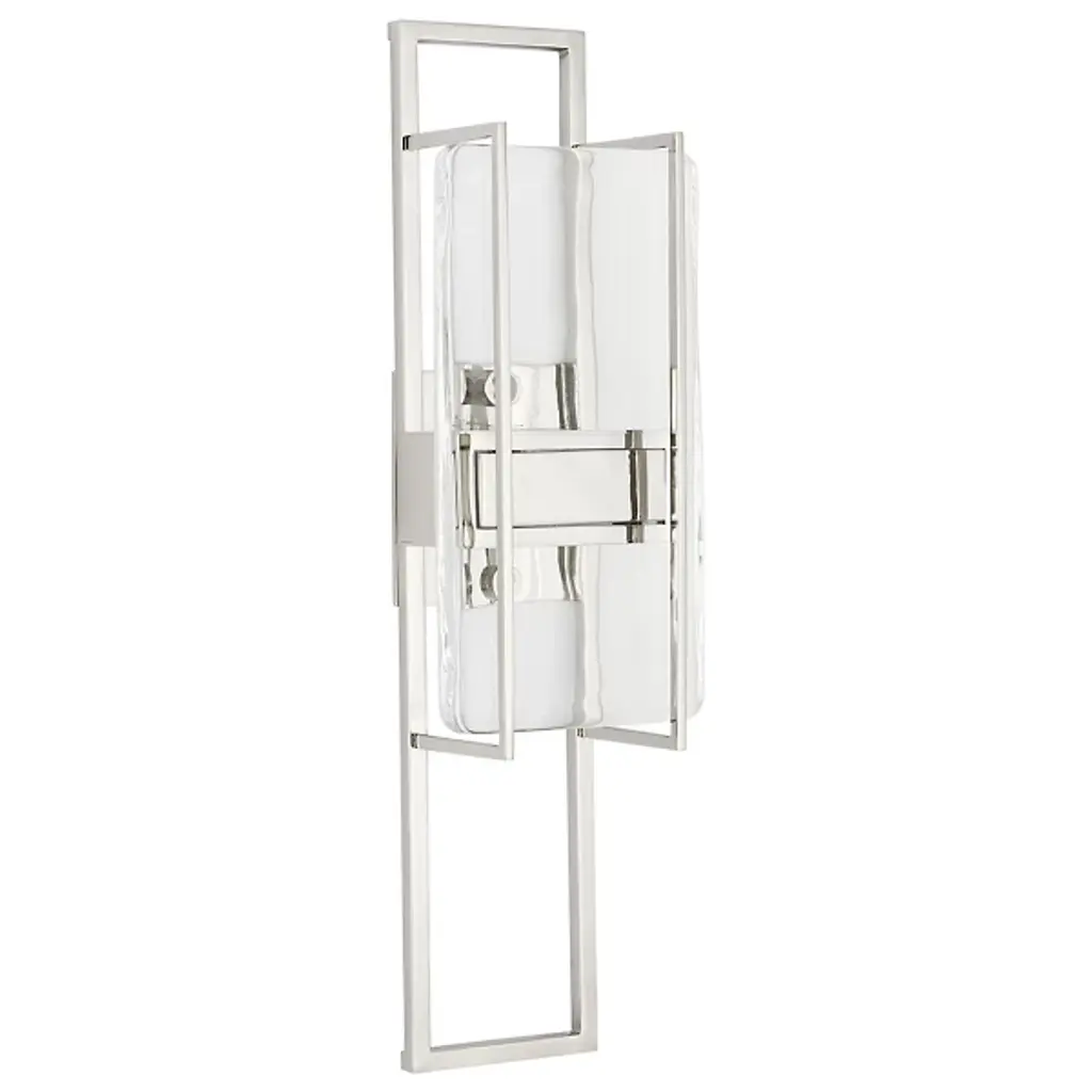 Line up picture frames or architectural features with the elegant, streaking design of the Duelle Tall Wall Sconce from Mick de Giulio for Visual Comfort Modern, formerly known as Tech Lighting, The piece rests at a low profile against the wall with a rectangular plate. In front, a square housing conceals the potent LED lamping to showcase the sconce's graphic silhouette. Slender, horizontal metal frames give the piece an attractive edge and airy feel. Slotting in between, a rectangular pane of clear, pressed glass diffuses glare from the front. The LED light casts an ambient glow on the wall and glazes the glass to enhance its artisanal texture.