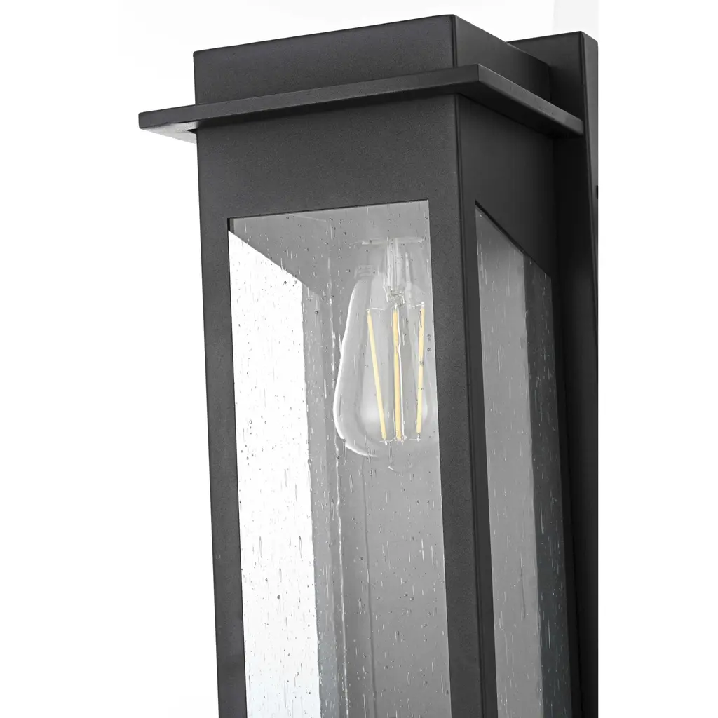 This outdoor wall sconce boasts a stunning combination of iron and seeded glass to create a modern and timeless appeal for your home's exterior. The sturdy iron frame envelops clear, textured glass panels, giving off a warm and inviting glow. The geometric pattern adds visual interest and sophistication, while the E26 socket allows you to pair it with a vintage-style bulb for that perfect accent lighting. This light effortlessly blends with a variety of styles, enhancing the charm of any outdoor spacefrom porches and patios to entryways. Its the perfect piece to transform your exterior with a soft, ambient glow while showcasing an eye-catching architectural silhouette.