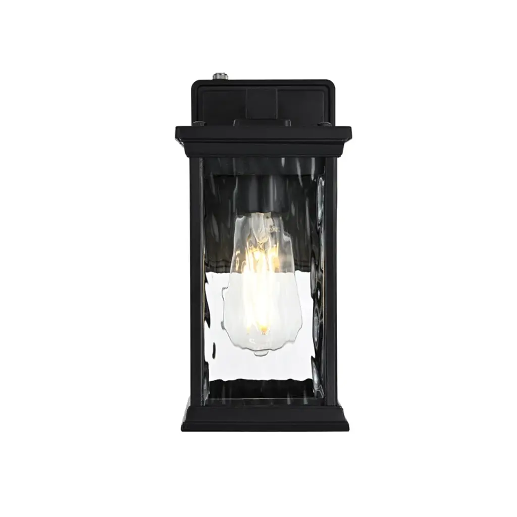 This outdoor wall sconce brings an instant touch of sophistication to your exterior décor. Crafted with an aluminum frame, the design features a distinctive rectangular shape with slightly flared accents at the top and bottom for added visual interest. The rippled glass panels enclose an E26 socket, designed to accommodate a traditional Edison-style bulb, which casts a warm and inviting glow. The combination of a sturdy aluminum frame and the rippled glass texture creates a timeless aesthetic, perfect for creating a cozy ambiance on porches, entryways, or patios. Its matte black finish ensures this wall sconce can seamlessly blend into modern, farmhouse, or transitional styled homes, while the durable construction ensures that it stands the test of weather and time.