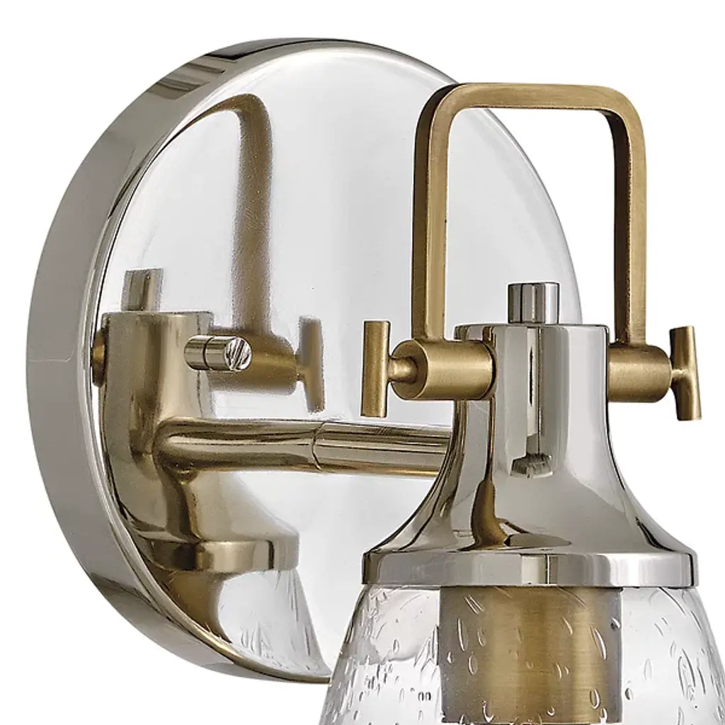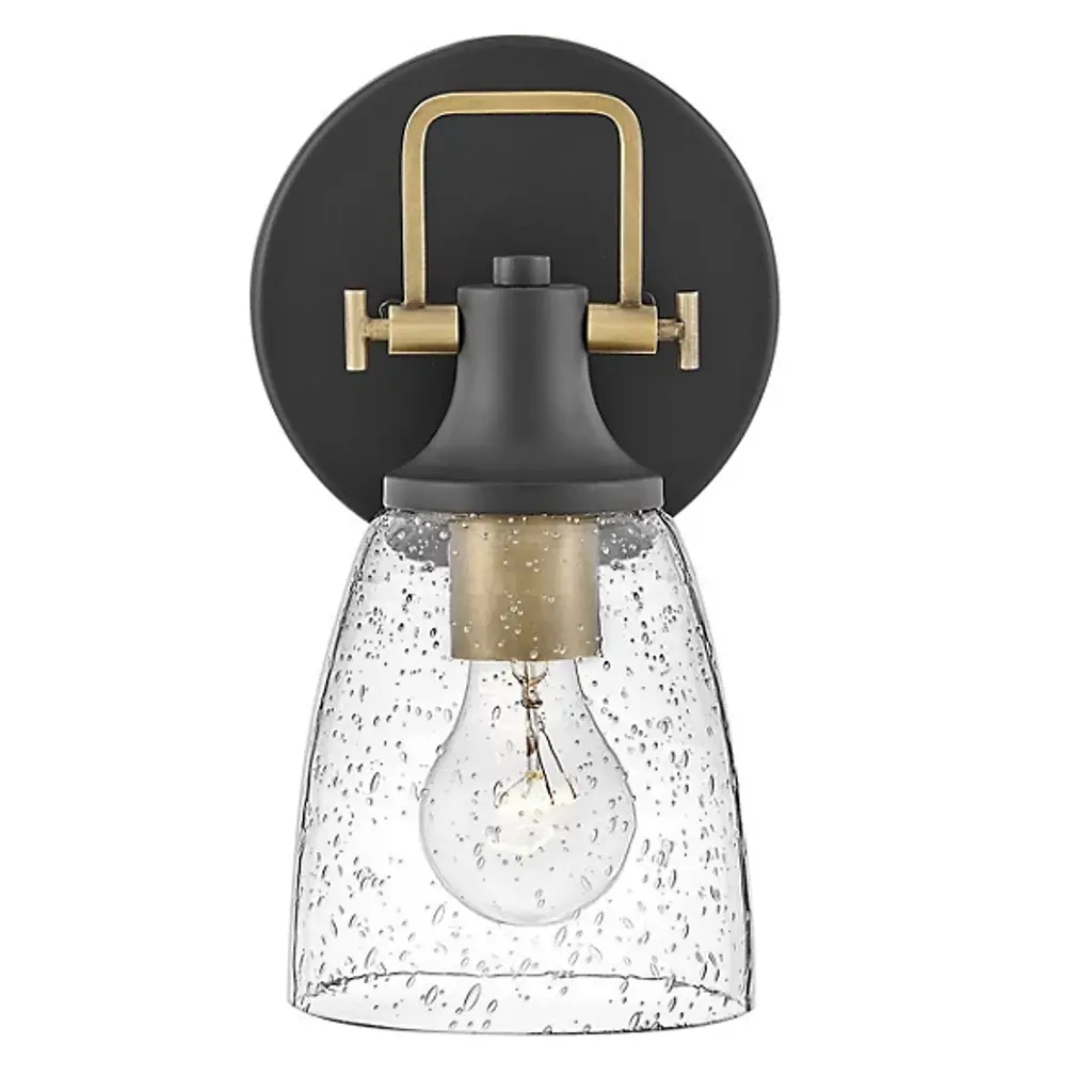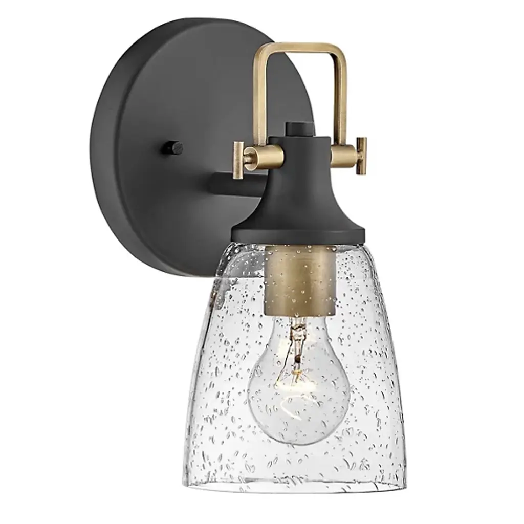 The Easton Bath Wall Sconce from Hinkley satisfies your taste for the modern and industrial with a handsome design fusion. Mounting to the wall with a compact backplate, this piece looks natural in tight nooks and open spaces. The piece rewinds the clock with vintage-style knobs and a dashing top yoke. The metal accents jump off the piece with a sleek, contrasting finish. The clear glass shade also grabs your attention as it presents a sea of seeded texture. When turned on, the seeded notes transform into fine highlights as a rich ambient glow radiates through.