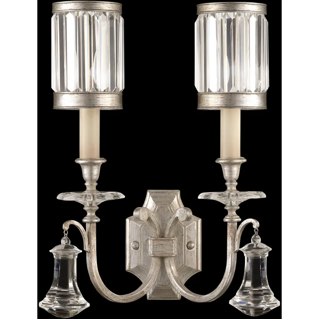 Sconce in rustic iron finish with garnet undertones. Features shades of faceted channel set crystal and brilliant pendants.