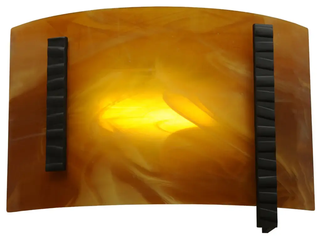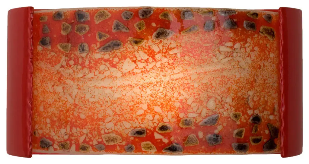 This one-of-a-kind wall light integrates Multi Fire fused art glass made from reclaimed window glass and Matador Red kiln-fired glazed ceramic. This crescent shaped horizontal sconce washes the wall with light from the top and bottom while illuminating the the textured ebb-and-flow design of fused glass. Subtle color and texture variations are the hallmark of a truly handcrafted piece of art. Standard Lamping: Uses (1) 60W E12 Candelabra Base Bulb. (Bulb not included)Number of Bulbs: 1Watts per Bulb: 60Standard Base Type: E12Mounting Center: 3.5in.Country of Origin: U.S.A.Warranty: One year limited warrantyResistant to rust and corrosion. Suitable for indoor or outdoor damp locations.ADA Compliant