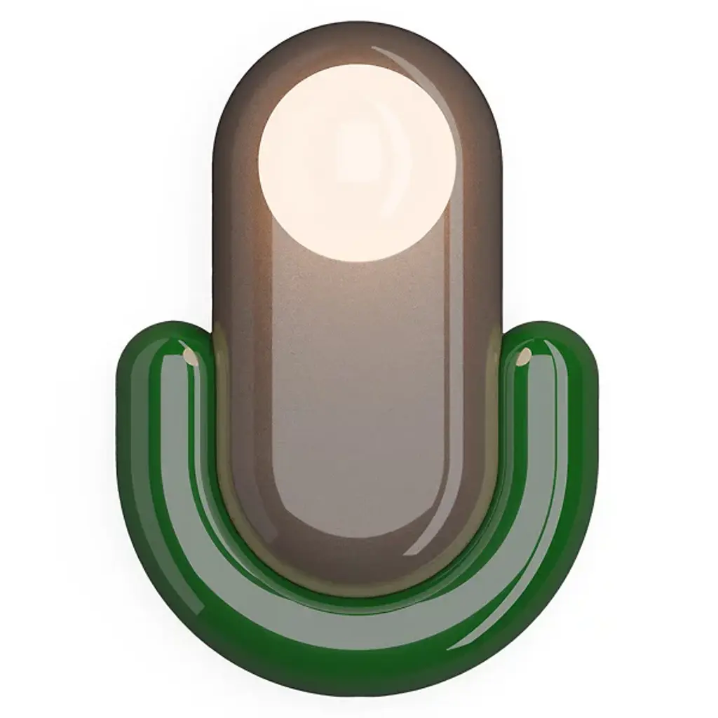 Colorful, casual, and contemporary, the Eclair Wall Sconce from Ferroluce introduces Italian elegance with a sweet sense of style. Made in Italy and inspired by the shape of the namesake filled baked good, it's surfaced in a glossy, candy-colored finish. The interlocking elements are pressed together, resembling gummy candies, to create an oval form that is placed inside a contrasting, U-shaped holder and extends a central lamp outward. The glass diffuser casts a generous glow across the smooth ceramic, showing off the careful craftsmanship and organic forms.
