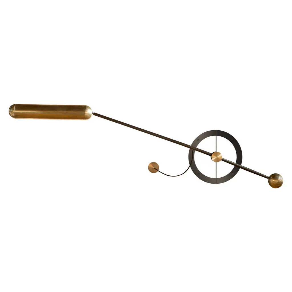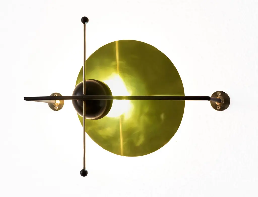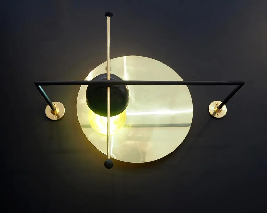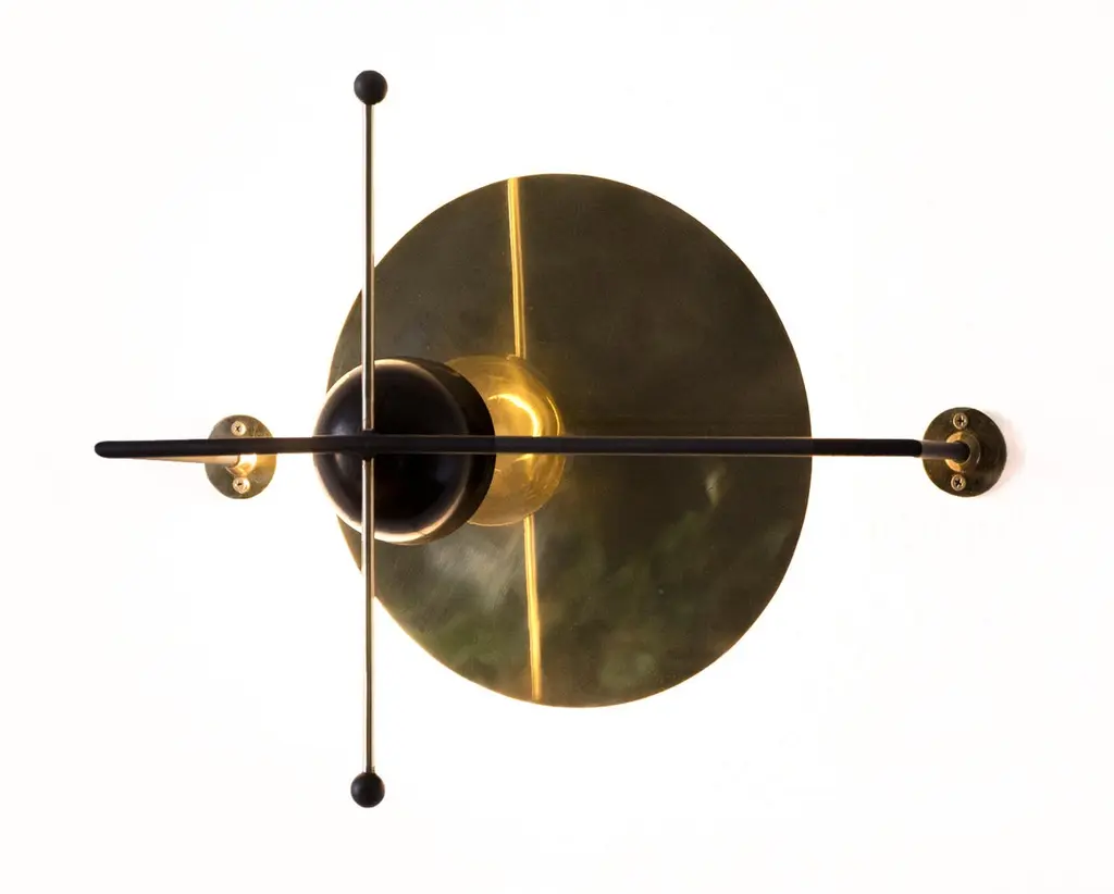 Eclipse lamp by Nomade AtelierDimensions: D35 x H17 cmMaterial: Brass, LED Lighting.Weight: 10 kgAll our lamps can be wired according to each country. If sold to the USA it will be wired for the USA for instance.Nomade Atelier pays homage to Laszlo Moholy-Nagy's geometrical and cosmic monograms and prints- from color scheme to construction. Mounted on a wall through three contact points, the sconce's warm and diffuse LED light emanates from a sunken deposit and is indirectly reflected by the central brass dome. The LMN sconce is a conversation piece that attracts like a piece of art and performs cleverly as well.Nomade Atelier is an exclusive art, design and production studio, headed by Mexican visual artist Diana Quintero Vallejo and French-Moroccan architect Ismael Bachri.Founded in 2012, this project is for us a great laboratory for learning and experimenting with materials and concepts. We are a studio dedicated to the design of ideas that take shape with the manufacture of custom-made objects and furniture for residential, public and commercial spaces, as well as artistic, scenographic and museum installations.