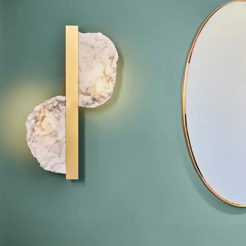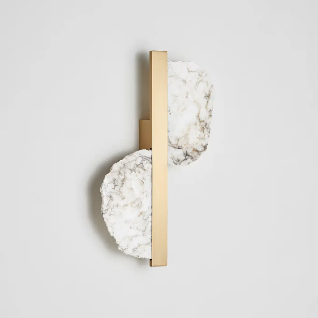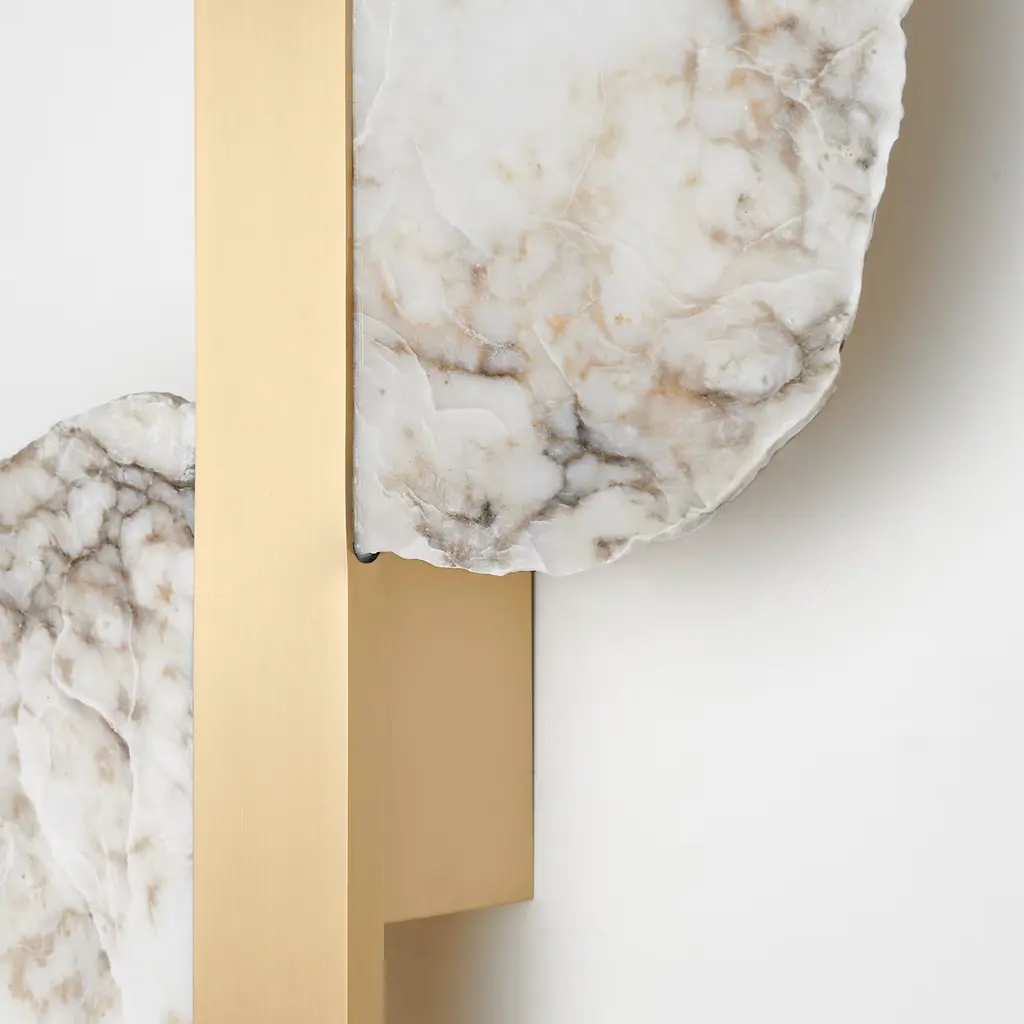 The Eclipse Satin Brass and Alabaster Wall Sconce beautifully merges natural elements with contemporary design. Featuring raw alabaster plates in their authentic form, it creates a captivating interplay of light and texture. The unique imperfections and veins of the alabaster are illuminated softly, resulting in a warm, organic ambiance that enriches any space. The satin brass body introduces a modern touch, contrasting elegantly with the alabaster’s roughness.