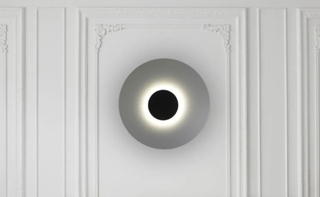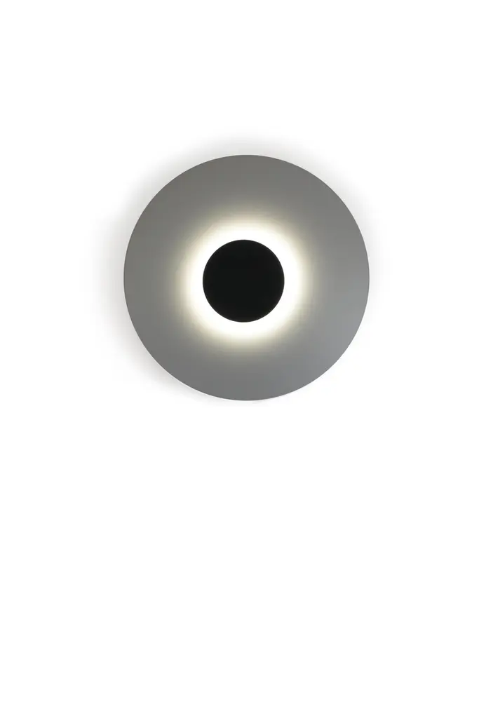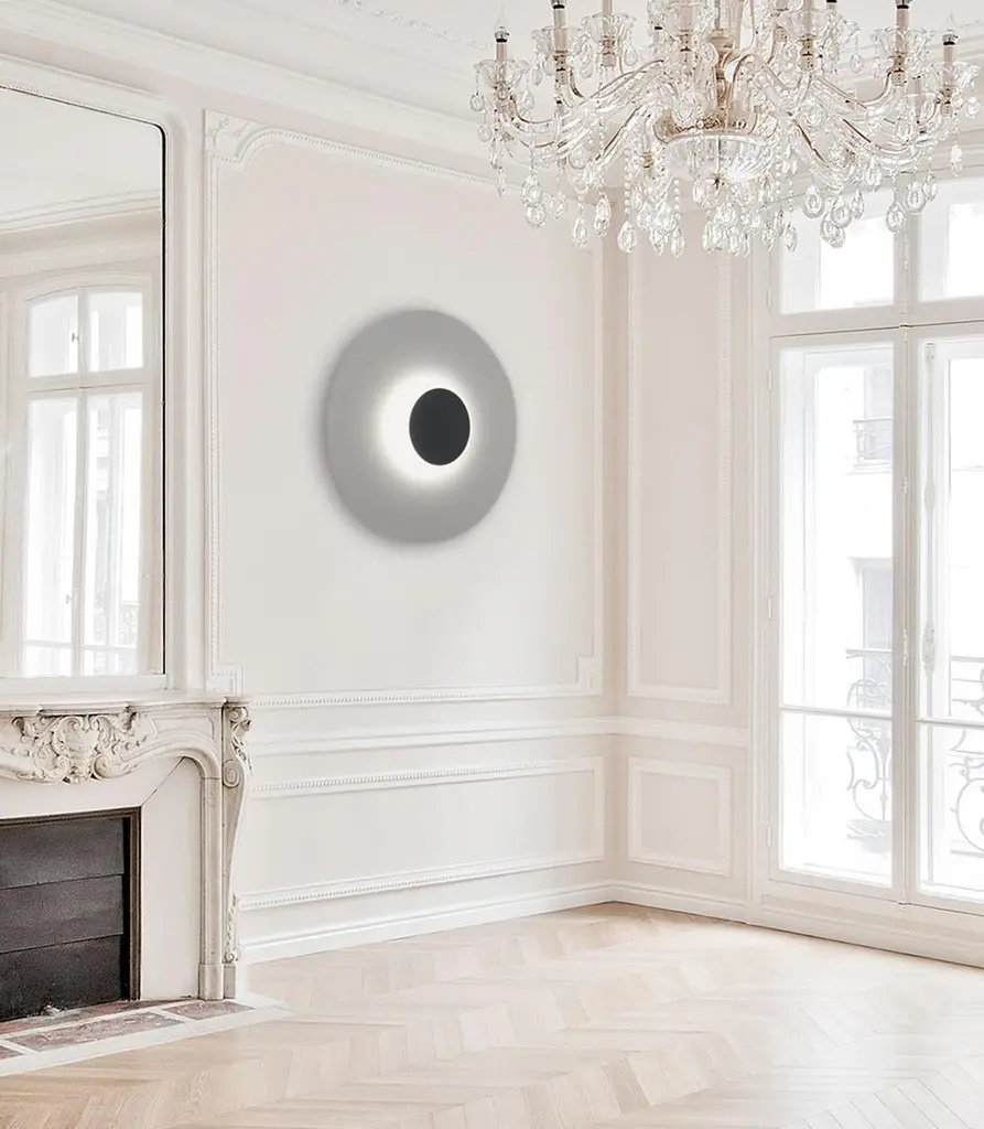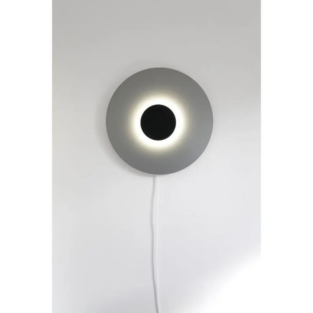 Eclipse sconce by Arturo Erbsman (Handcrafted design artwork by Arturo Erbsman)Limited edition, signed and numberedDimensions: 59 x 59 x 0.7 cmMaterials: Anodized aluminum disc, mirror, LED spotlight, wood, steel baseAll our lamps can be wired according to each country. If sold to the USA it will be wired for the USA for instance.The Eclipse series pays homage to the visual beauty of a total eclipse, giving indoor stargazers the everyday chance to witness and appreciate the meeting celestial moment. A lamp that draws inspiration from the astronomical phenomenon of an eclipse. Composed of a lamp frame made of treated mirror, it diffuses a soft white light. The light can be white or yellow thanks to the light dimmer.Arturo Erbsman is a French designer whose works reflect different points of intersection between manufactured objects and the four elements of nature. He focuses on showing the delicacy of distinct aspects of water like ice, snow, stalactites, condensation and vapor in his handmade lighting objects. He derives his source of inspiration from his faraway travels and from closely observing natural phenomena of everyday life.