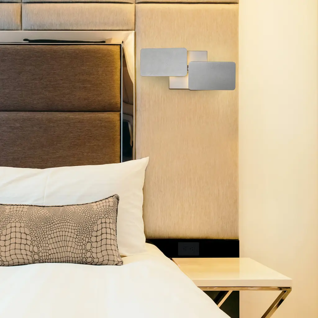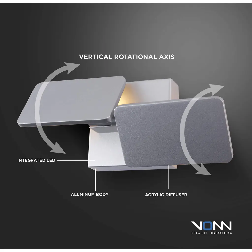 From VONN's Eclipse Series, the VMW17200AL Integrated LED Wall Sconce is a modern 12-inch fixture made from aluminum and acrylic, with a Silver aluminum backplate and an Integrated LED Shade. The shade consists of 2 Vertical Rotational Axis. Emitting a soft white ambient light at 3000 Kelvin, it offers dimmable functionality. With 108 Lumens brightness, an energy-efficient power consumption of 6 Watts, and CRI 80, this wall sconce combines style and efficiency for versatile and customizable illumination.