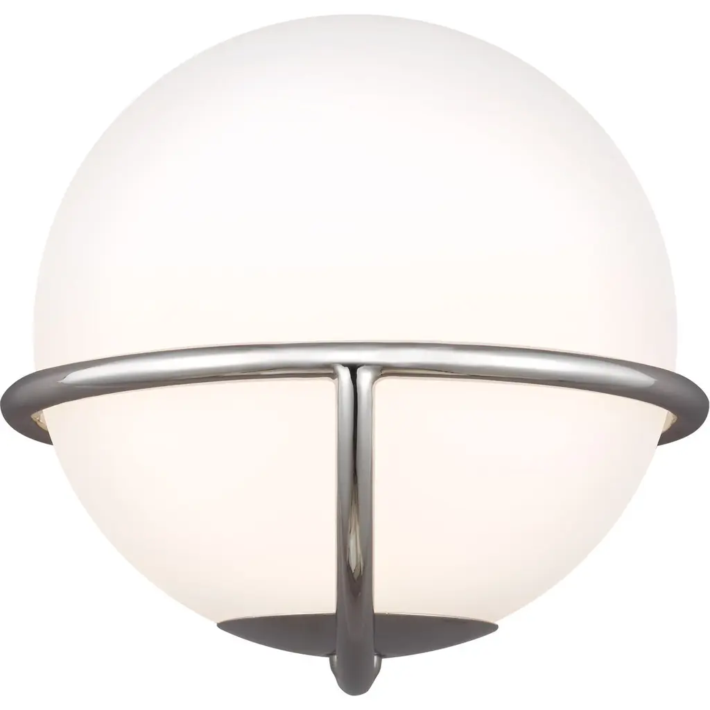The modernist Apollo impresses with perfectly balanced White Opal Etched Glass globes that gently rest within a spherical Burnished Brass or Polished Nickel frame. Apollo's cosmic appeal and artistic mid-century design is sure to become the focal point of any space.
