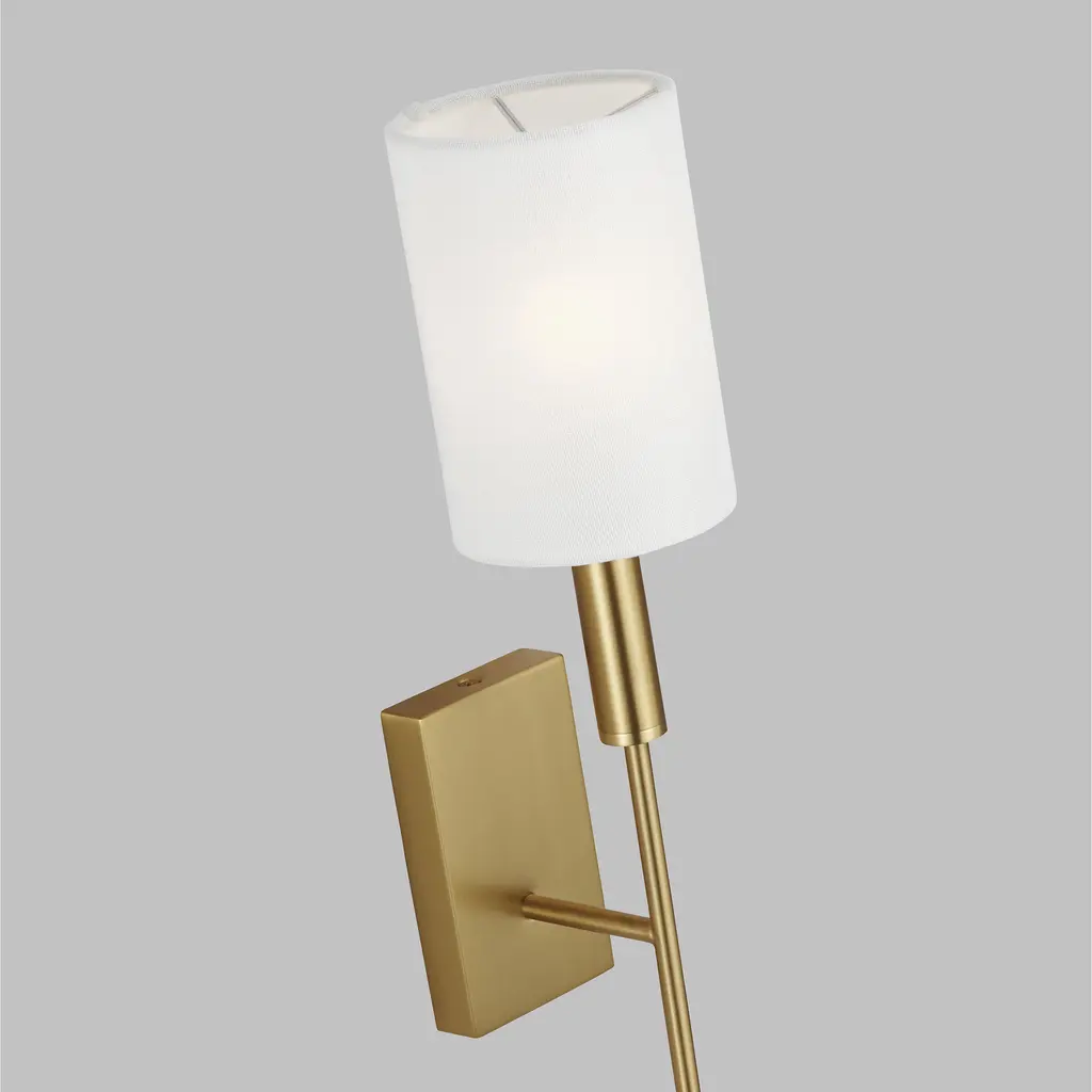 The Brianna one light wall sconce by Ellen DeGeneres in Burnished Brass offers shadow-free lighting in your powder room, spa, or master bath room. Brianna's graceful, seamless curvature and elongated tubular arms lend fluidity and modern appeal to this classic minimalist silhouette. Available in rich Aged Iron, Burnished Brass and Polished Nickel finish. Brianna wall sconces include cylindrical shades in fresh White Linen. We are expanding this top selling series by Ellen DeGeneres to include a tail sconce in three finishes.